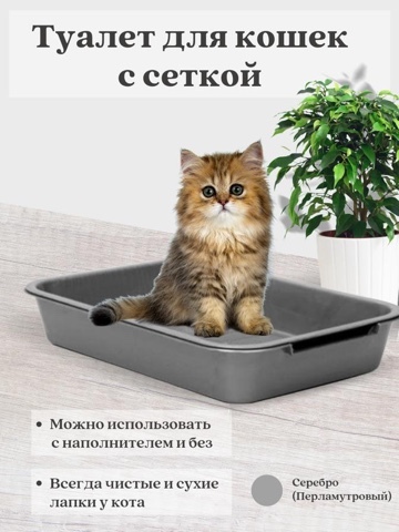 Туалет для кошек и собак лоток средний с сеткой. 36 х 26 х 6,5 см, серебристый