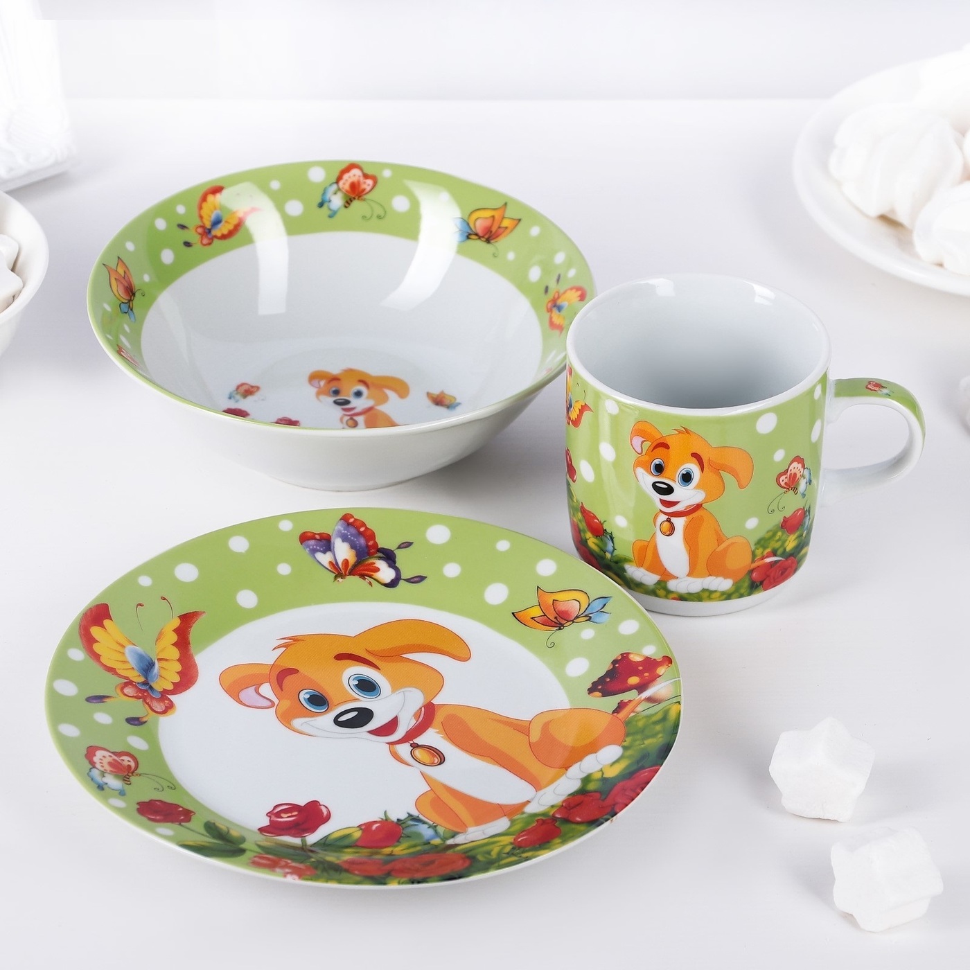 Набор посуды для детей, Щенок, 3 предмета: кружка 230 мл, миска 400 мл, тарелка 18 см