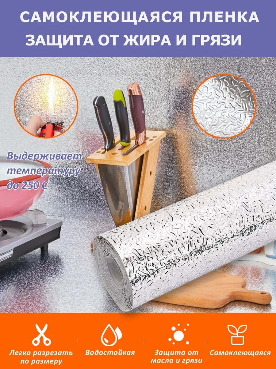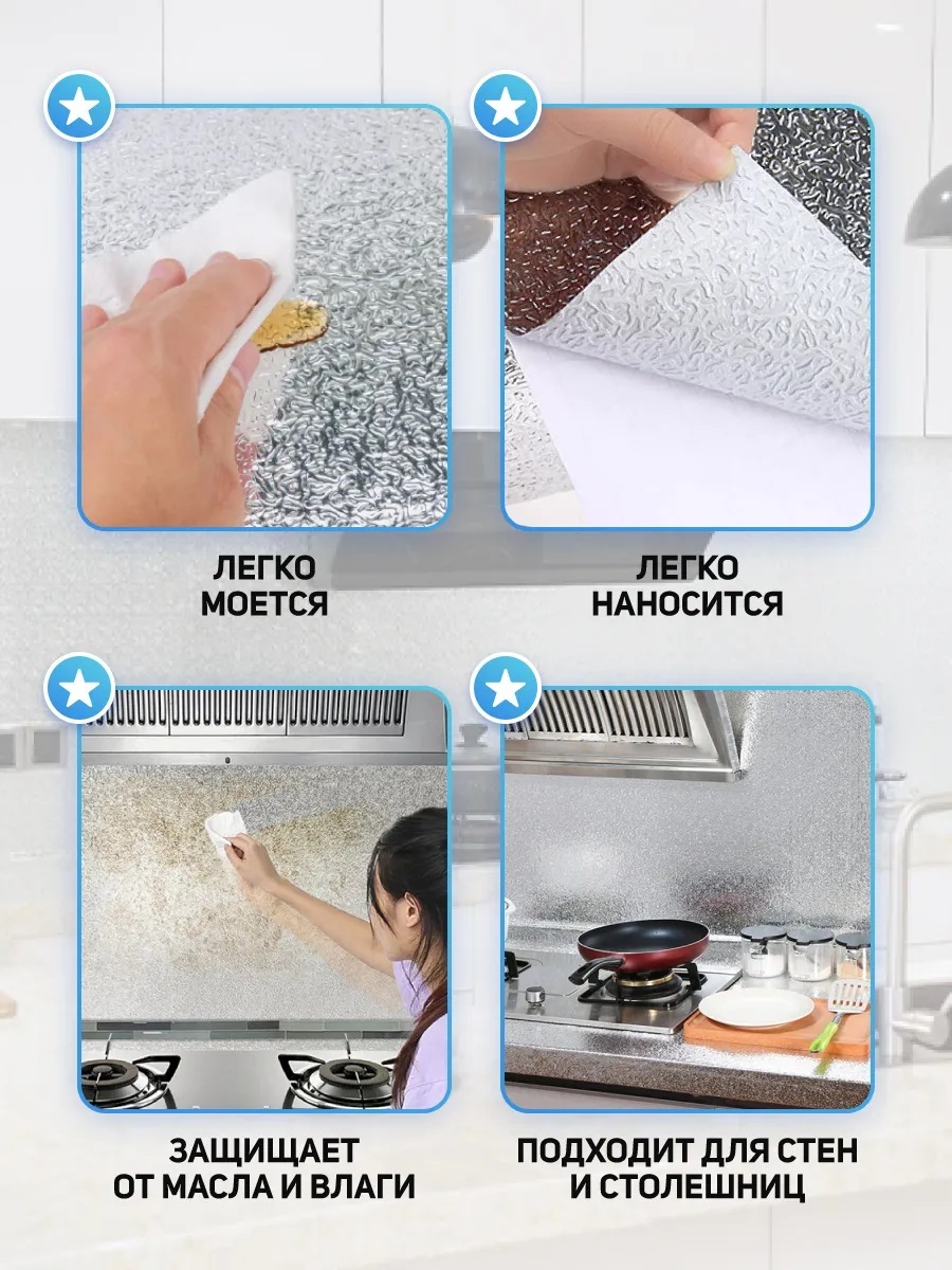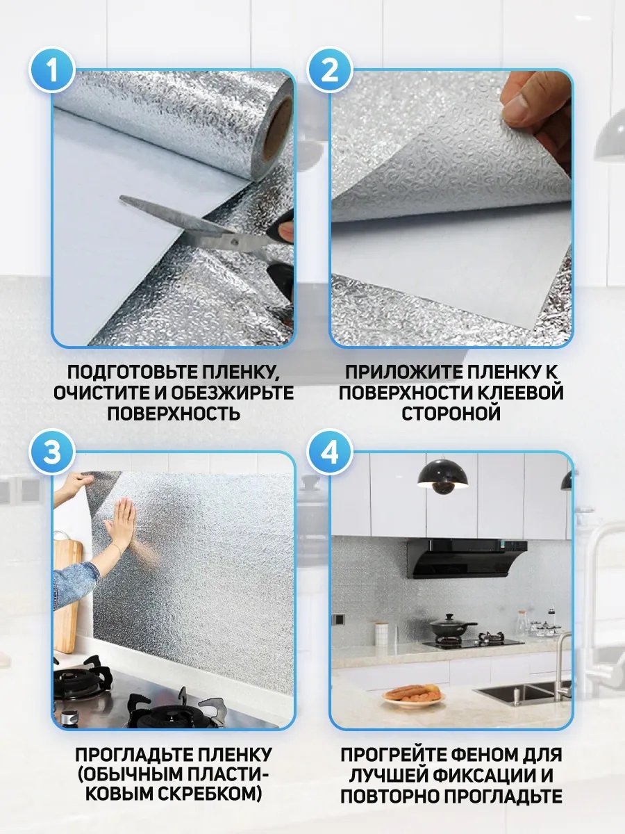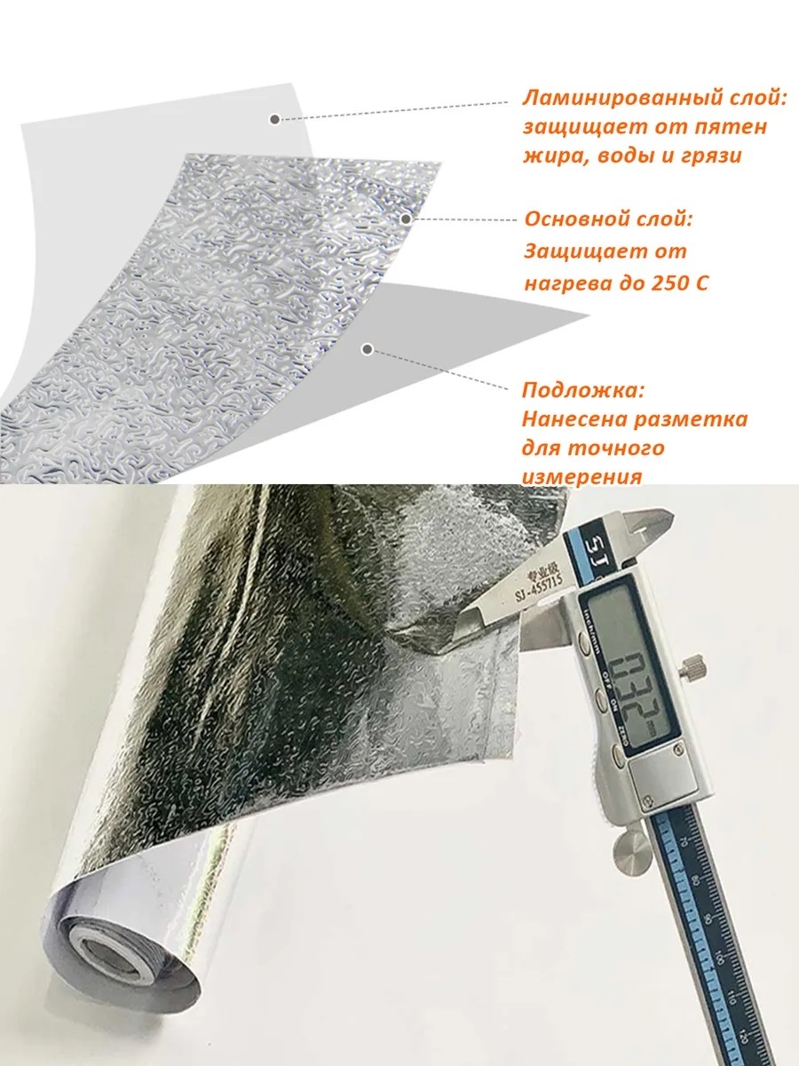 Защитная кухонная самоклеящаяся пленка-фольга 60х300 см. Серебряная жироотталкивающая наклейка от брызг и жира.
