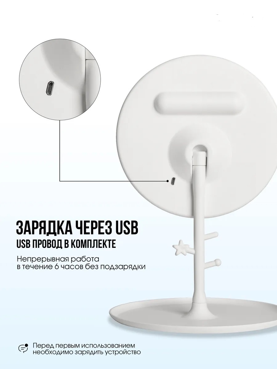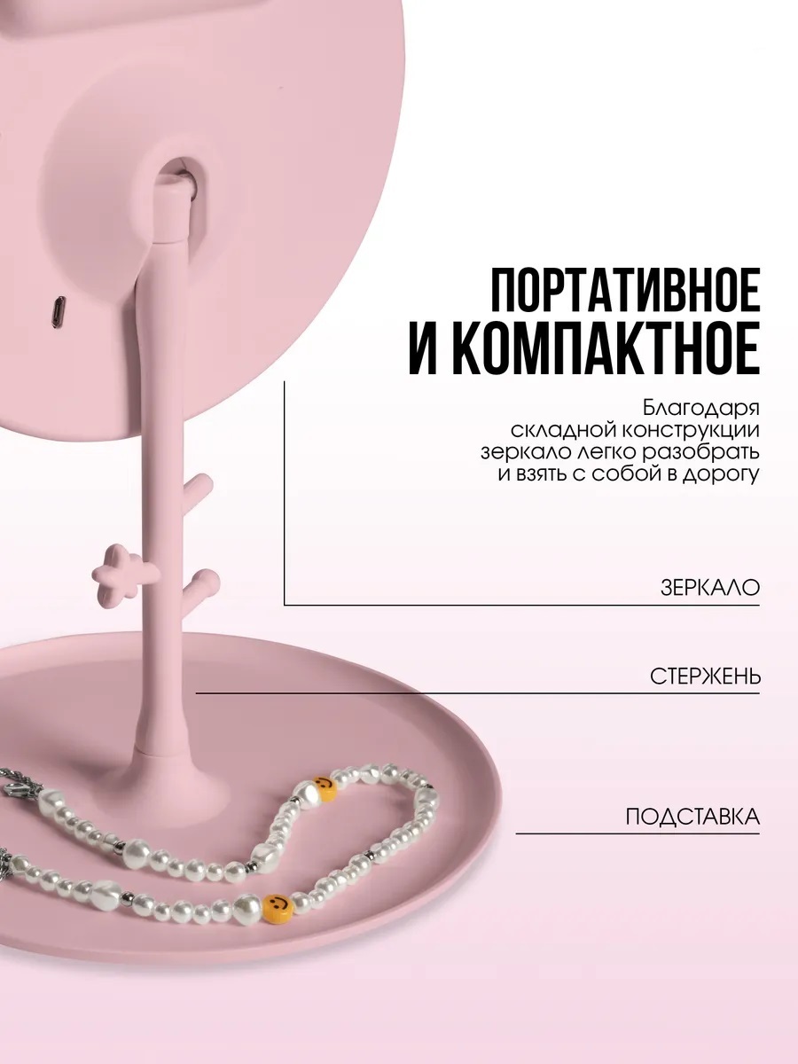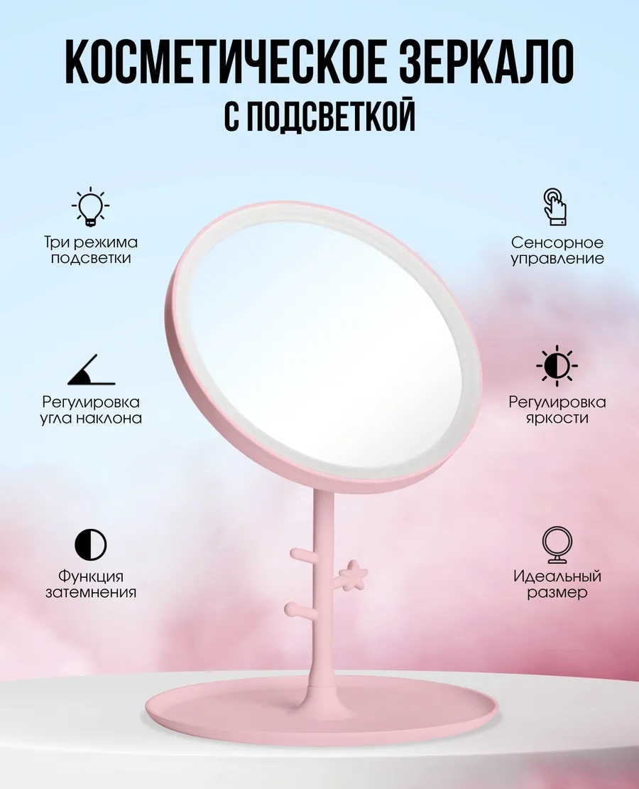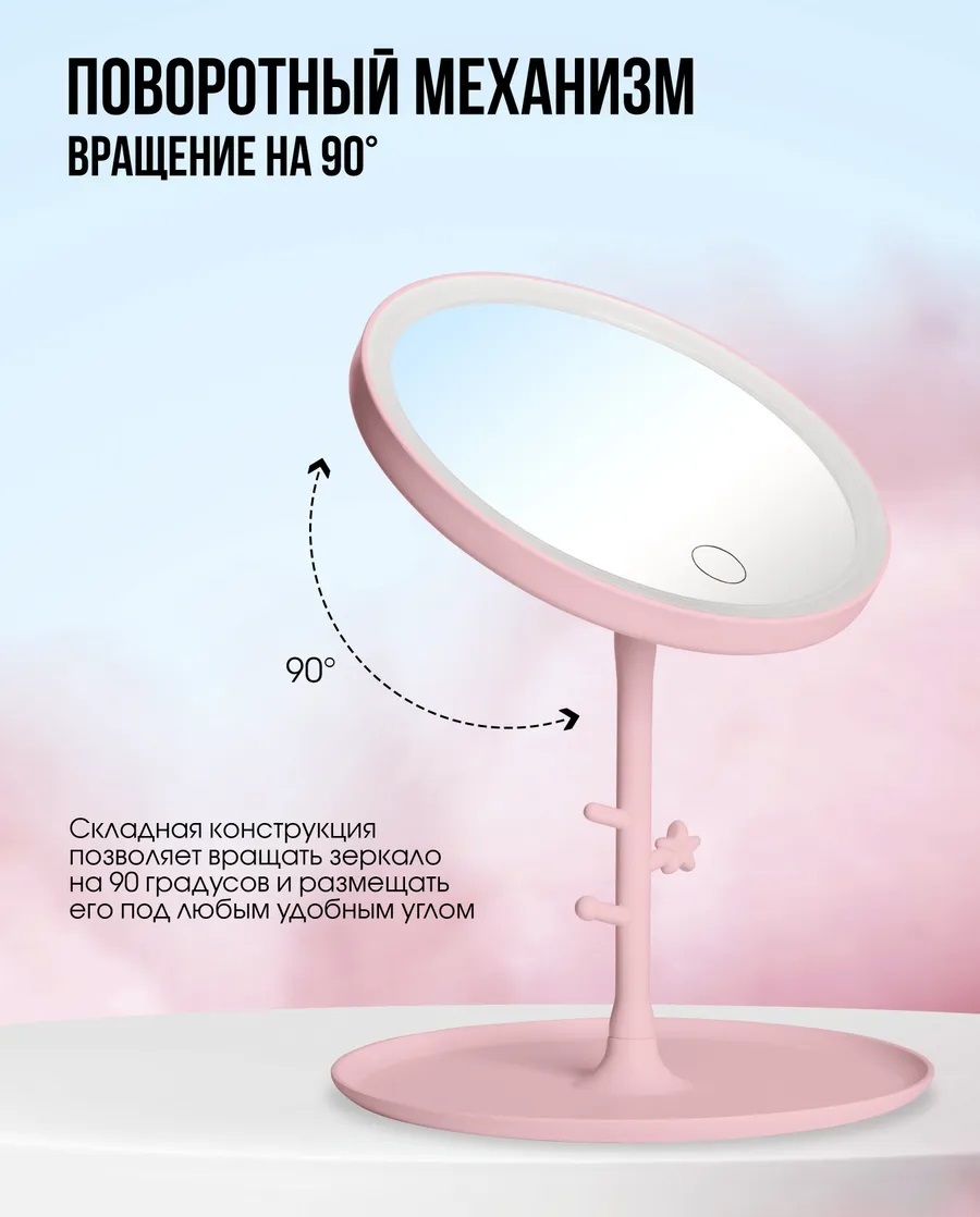 Зеркало косметическое с тремя режимами подсветки, регулировкой яркости и держателями для украшений.