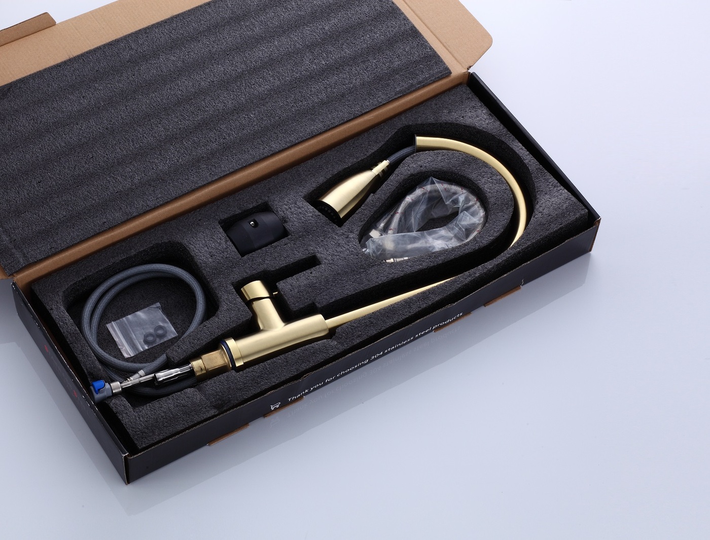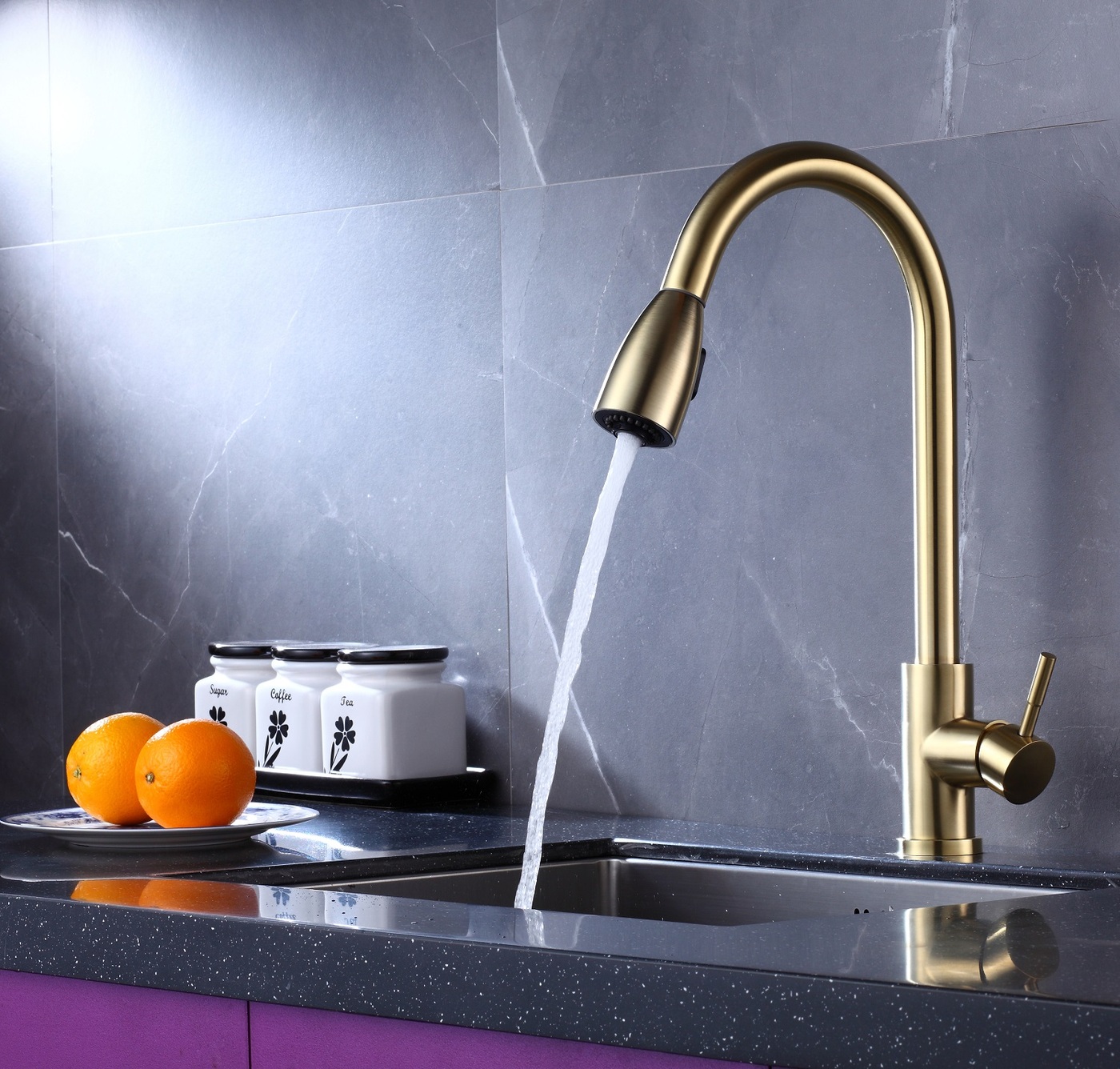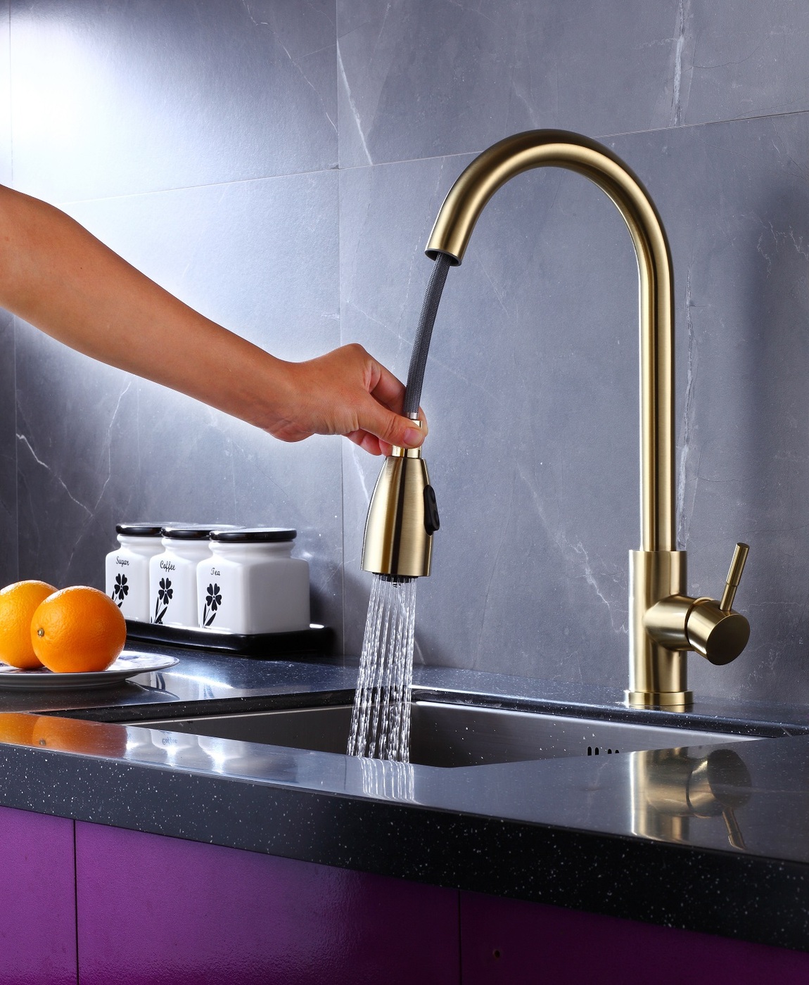 Смеситель для кухни с выдвижной лейкой и двумя режимами: душ/струя, цвет светлое золото REEF MY1979-5