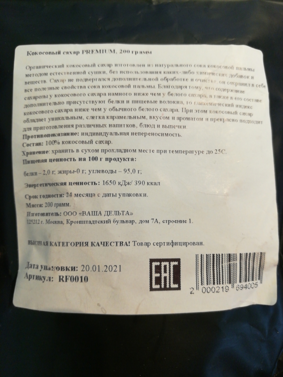 Кокосовый сахар PREMIUM, 200 грамм