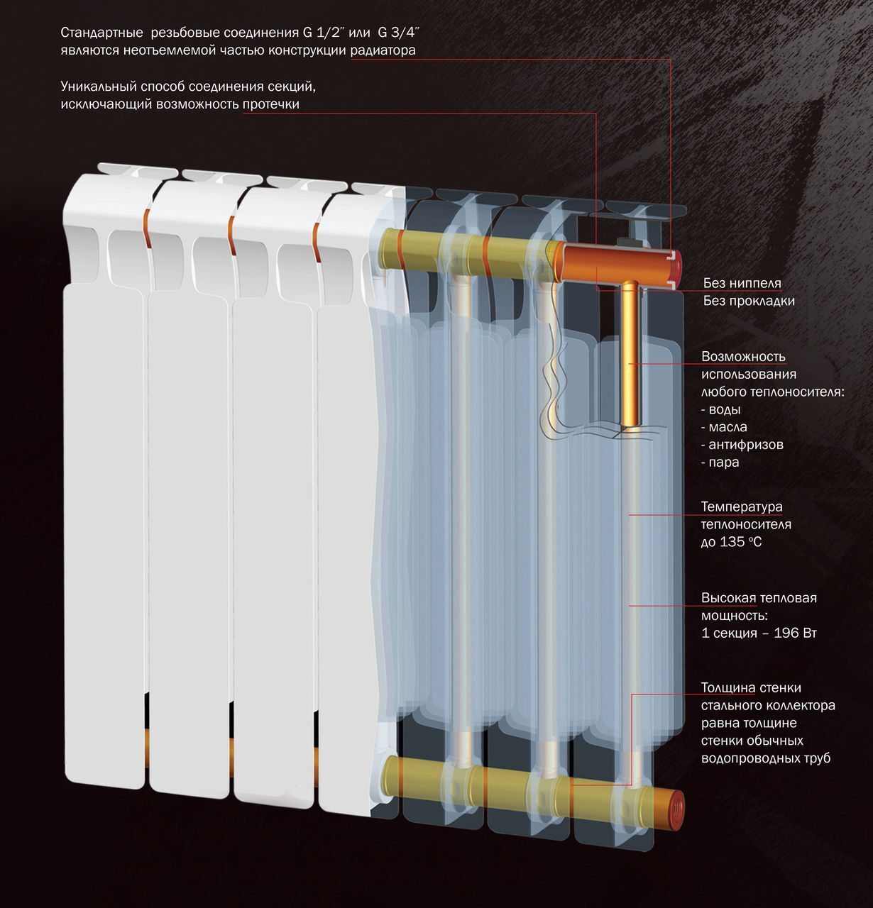 Секционный радиатор Биметалл Rifar Monolit 500 правое, 8 секц.