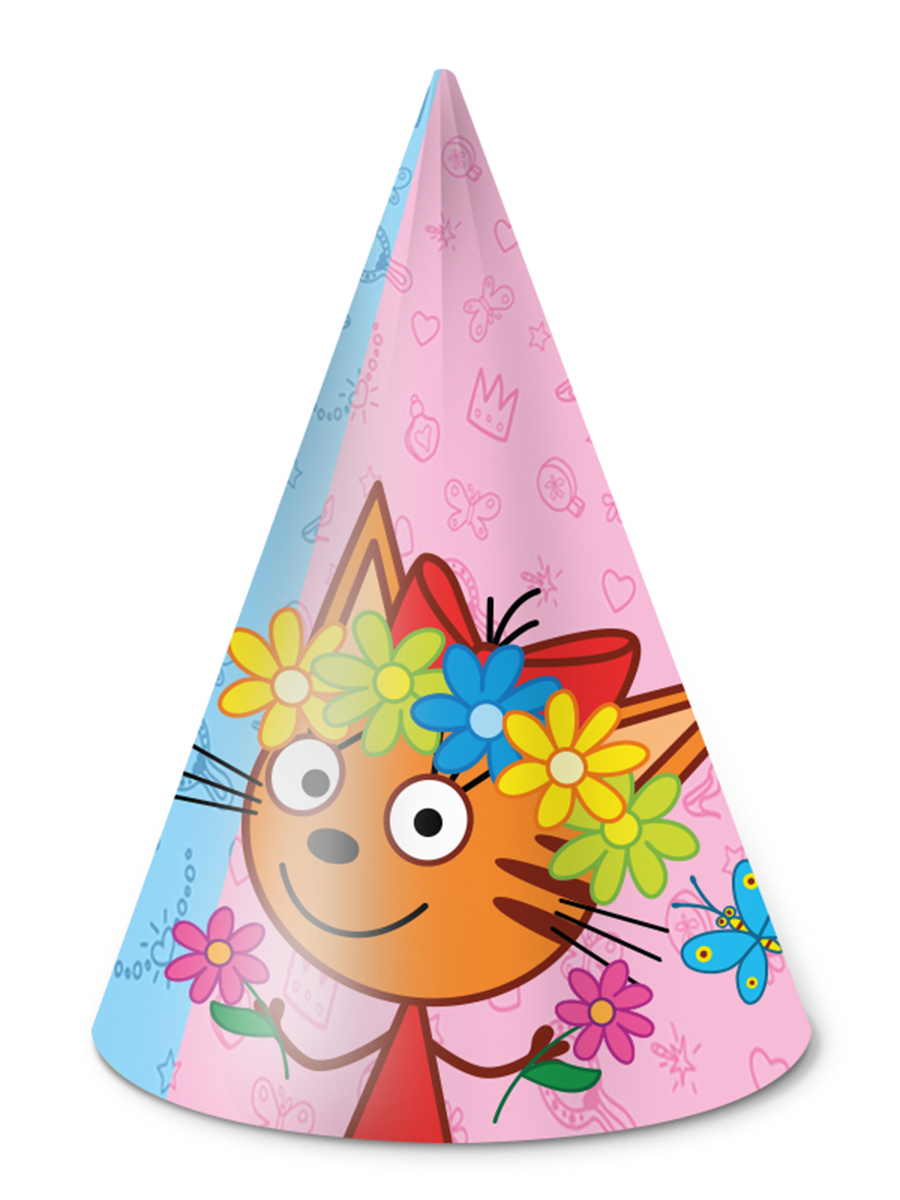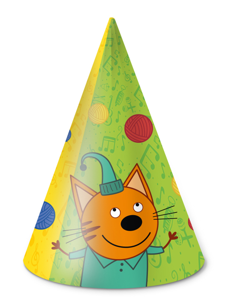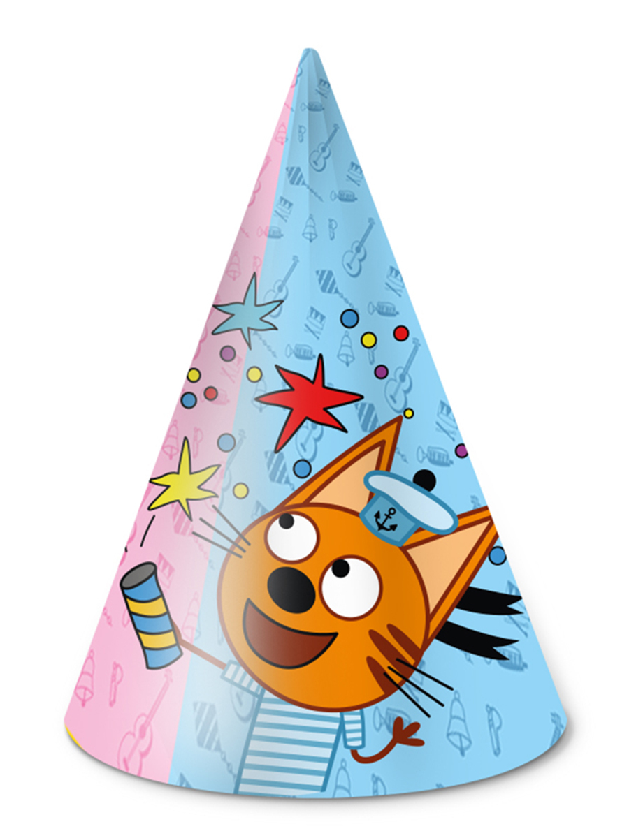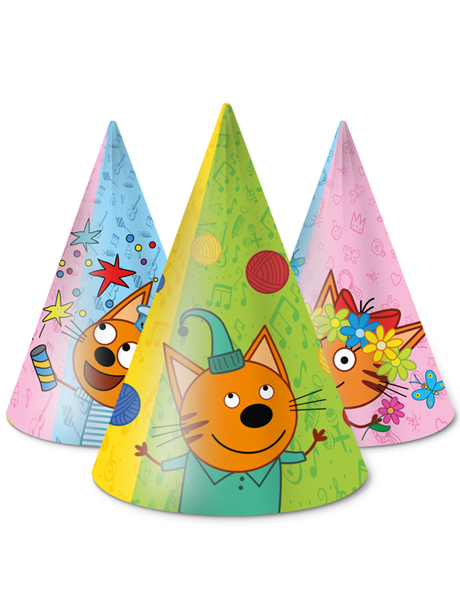 Праздничные колпаки картонные/бумажные Riota на день рождения Три кота Играем вместе, 6 шт.
