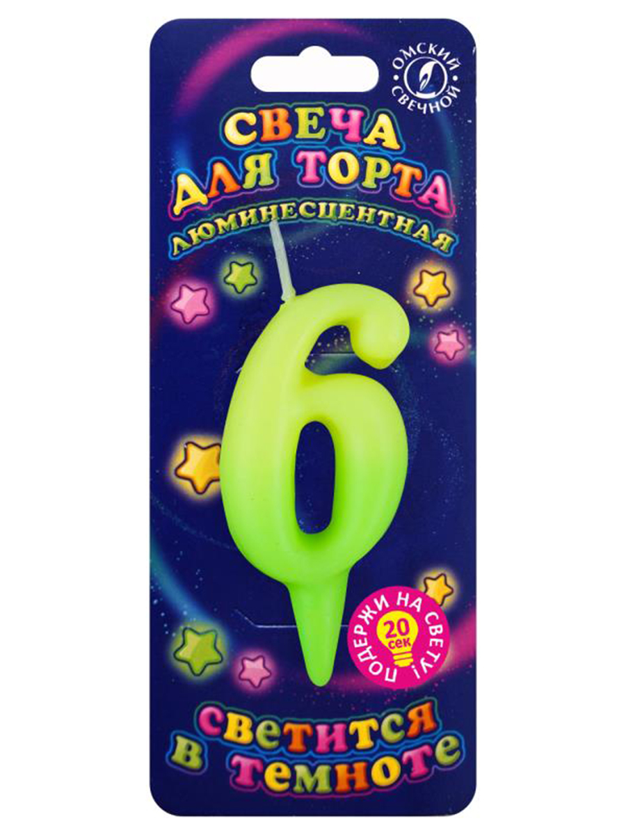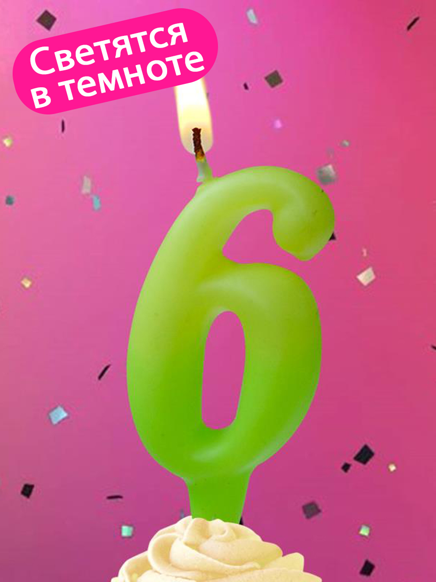 Свеча для торта парафиновая Riota для торта Люминесцентные Светящиеся в темноте Цифра 6, 8 см, 1 шт