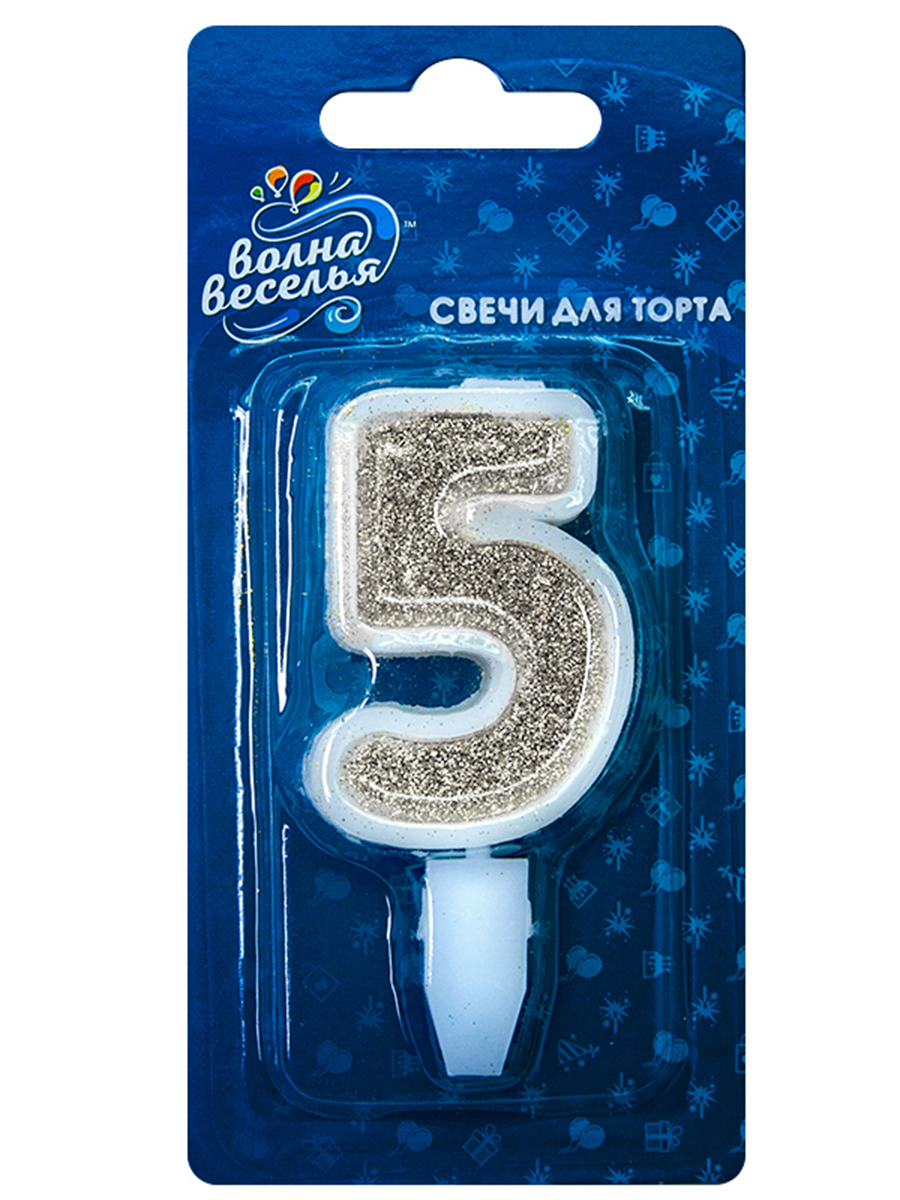 Свеча для торта парафиновая Riota Серебряная цифра 5 с блестками на торт, 5 см, 1 шт.