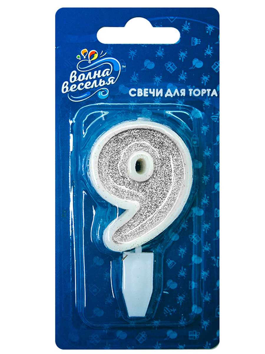 Свеча для торта парафиновая Riota Серебряная цифра 9 с блестками на торт, 5 см, 1 шт.
