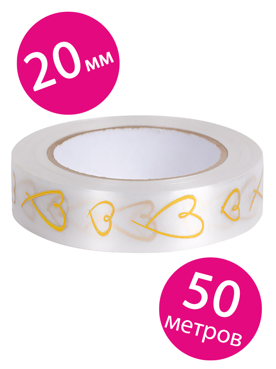 Лента упаковочная для подарков Riota с рисунком "Золотые Сердечки" белая, 2см х 50 м