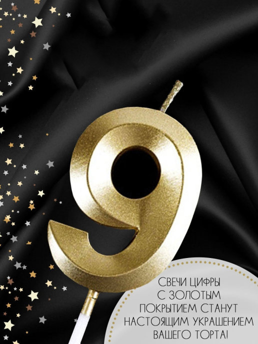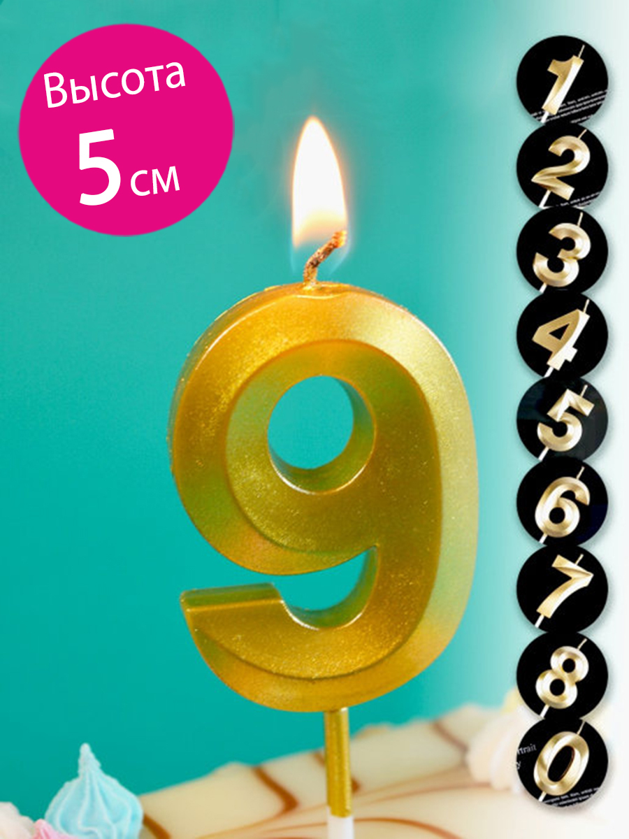 Свеча для торта парафиновая Riota для торта Золотая Цифра 9, 5 см, 1 шт