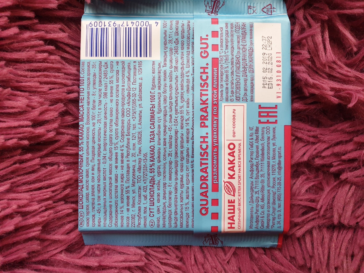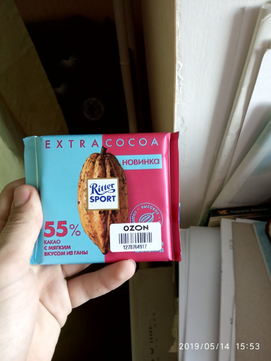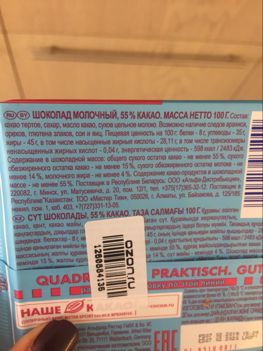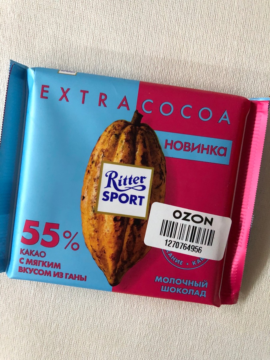 Шоколад молочный Ritter Sport "55% какао", с мягким вкусом из Ганы, 100 г