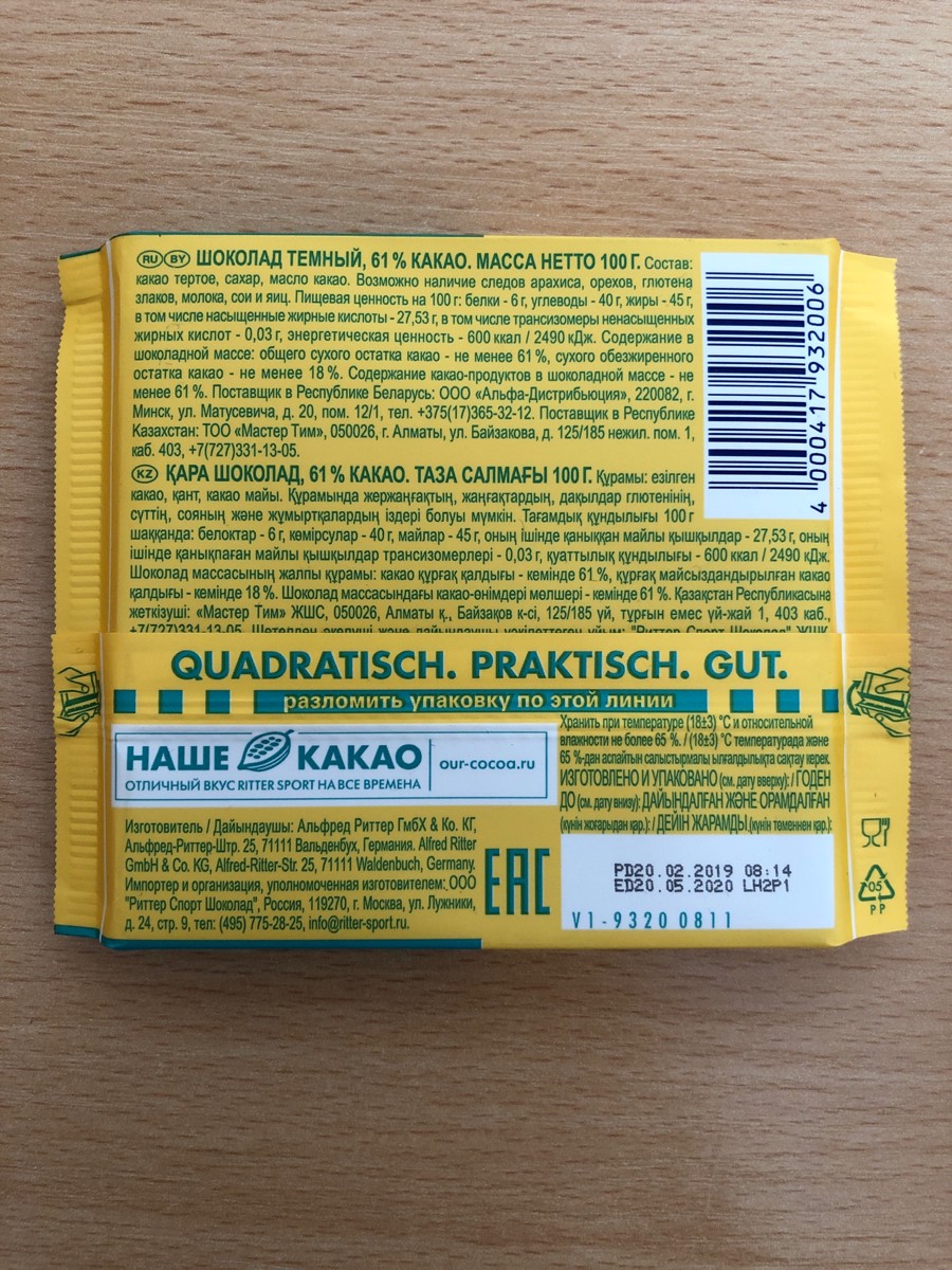 Шоколад Ritter Sport темный с утонченным вкусом из никарагуа 61%, 100г