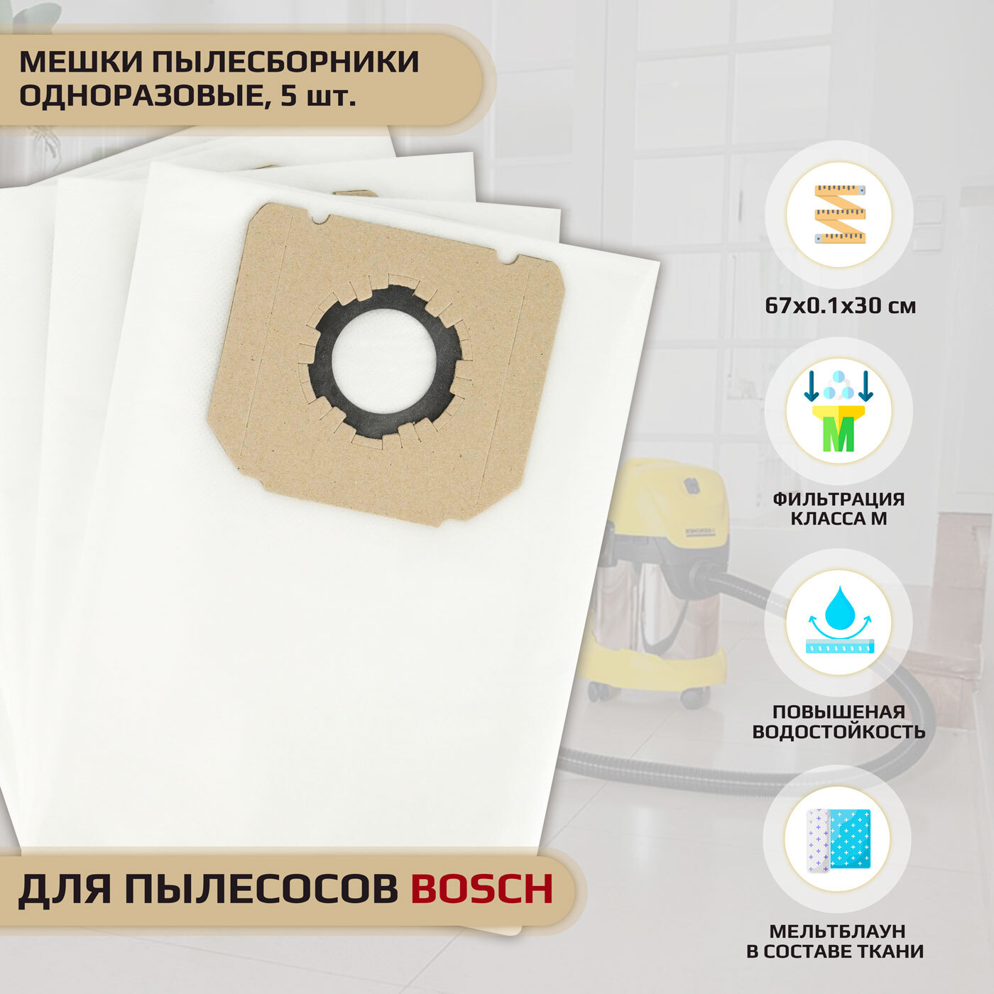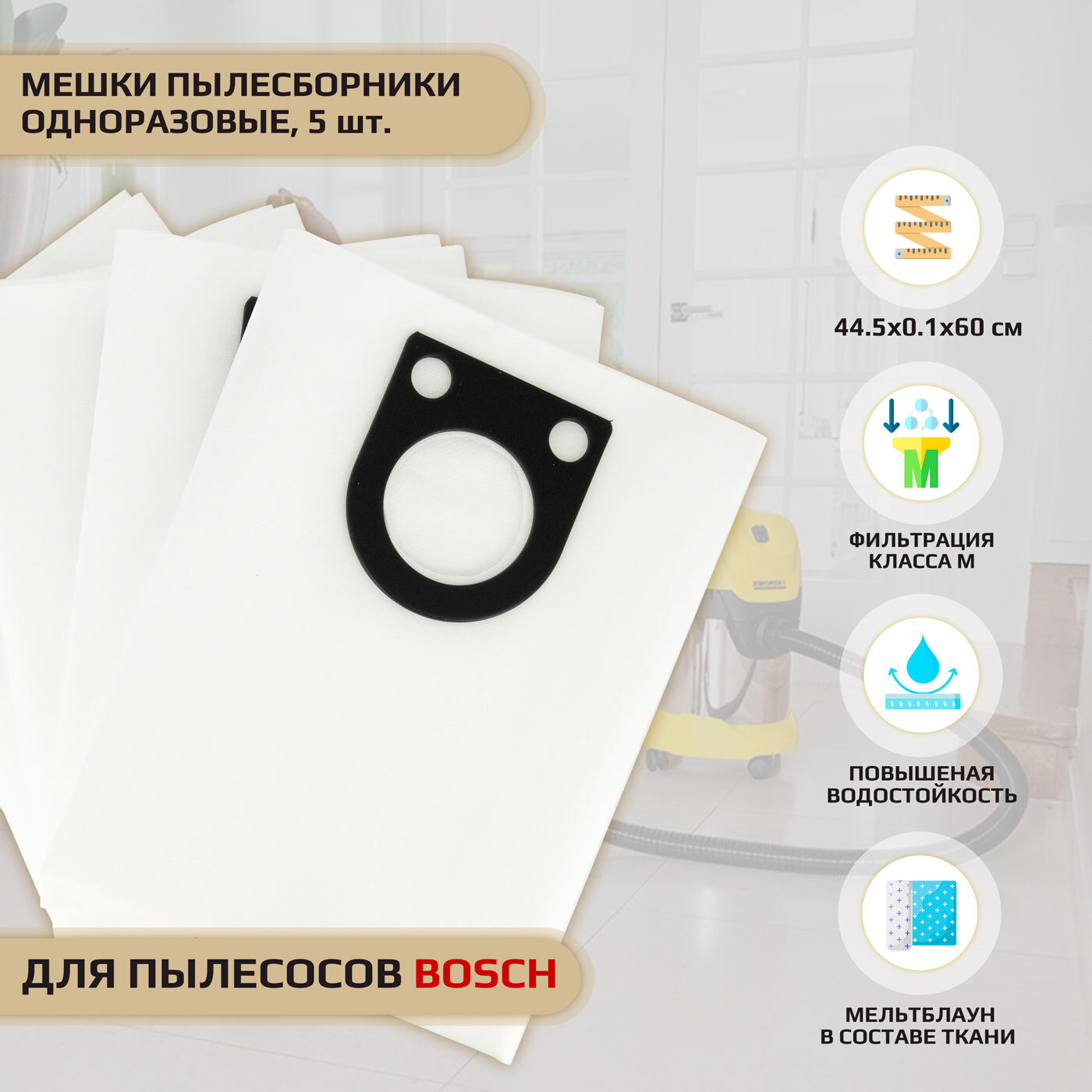 Мешки пылесборники для пылесоса BOSCH GAS 25 одноразовые синтетические ROCKSTAR R5-SV (5), 5 шт.