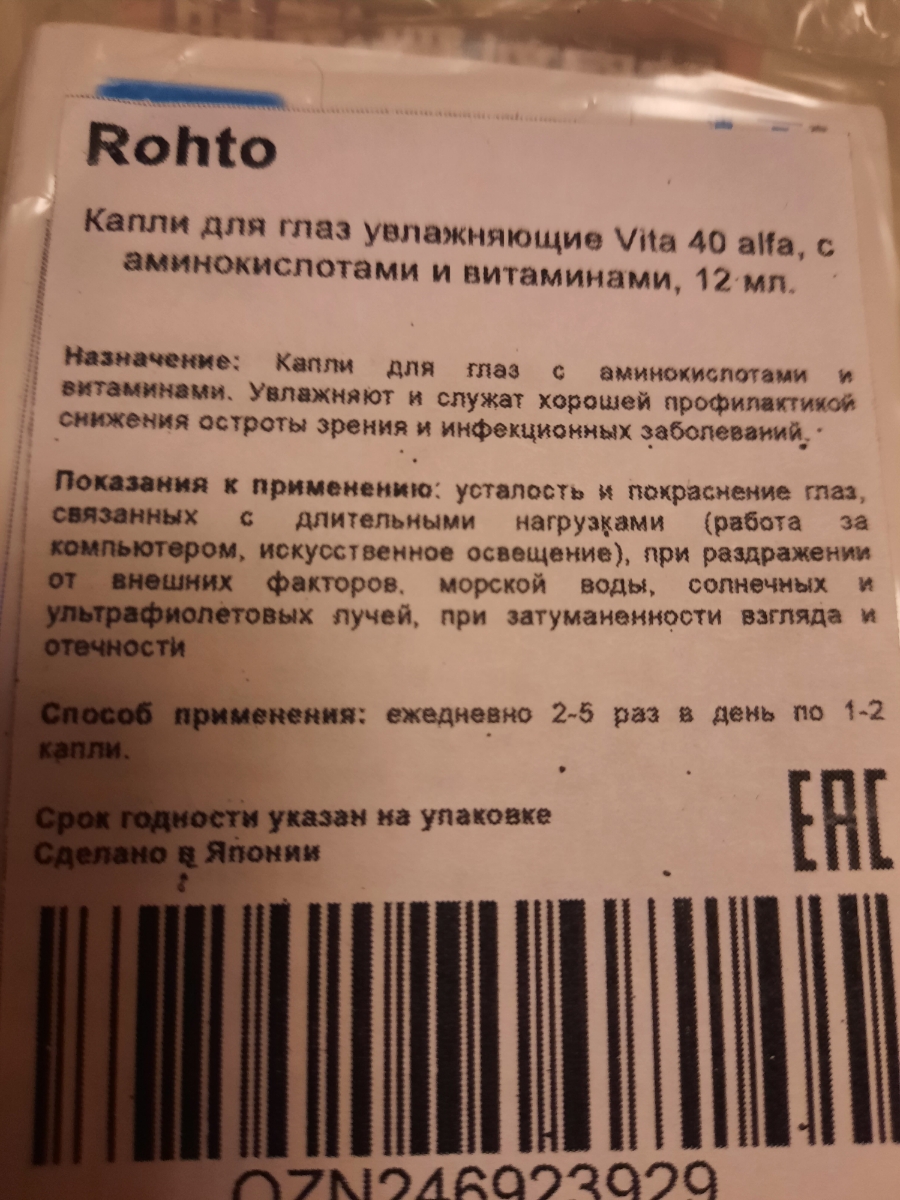 Капли для глаз увлажняющие Rohto Vita 40 alfa, с аминокислотами и витаминами, 12 мл.