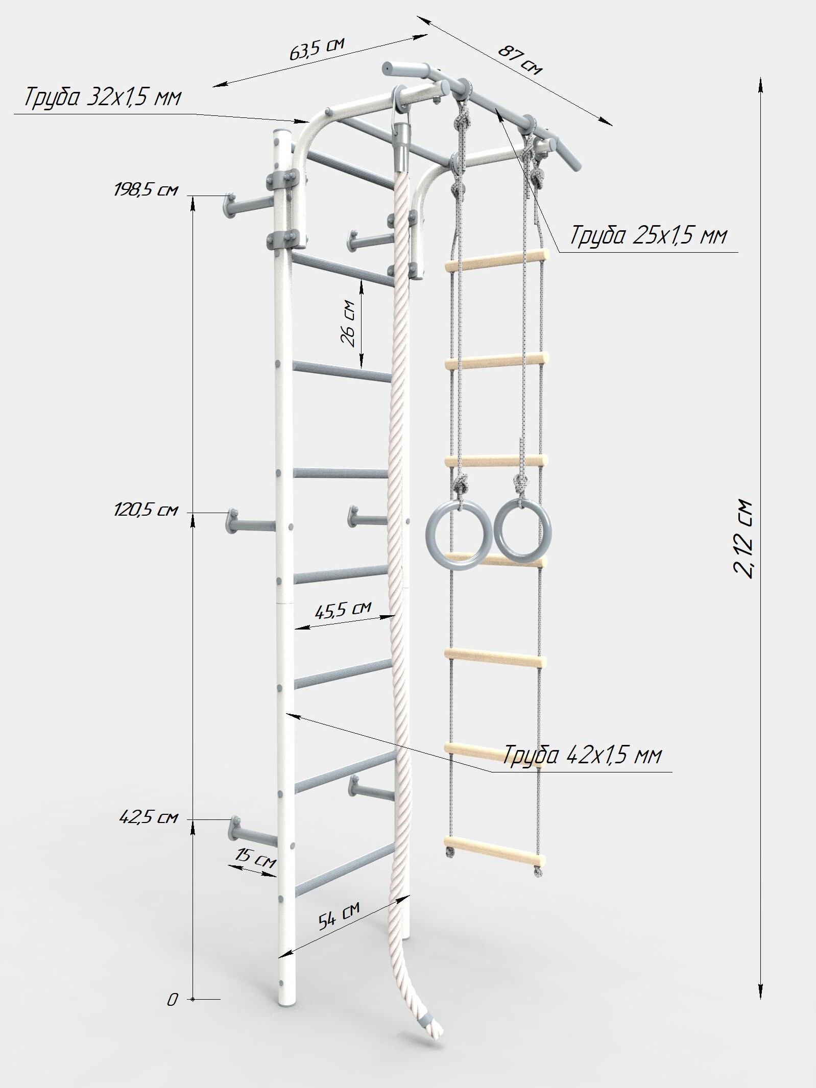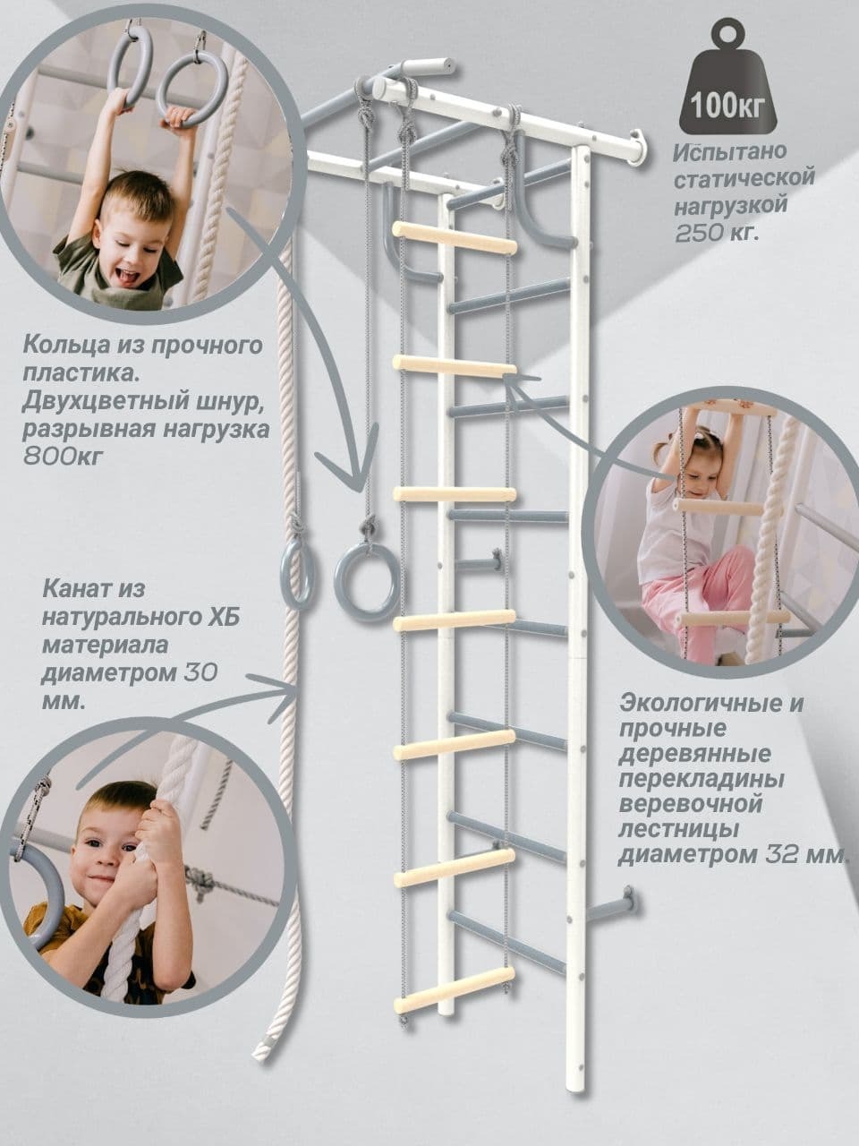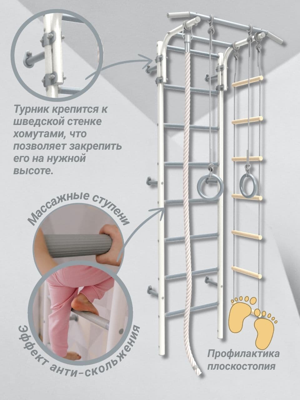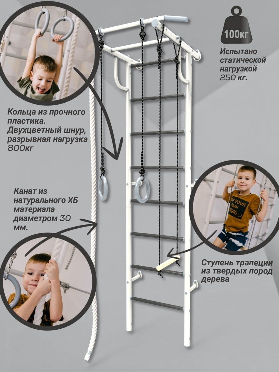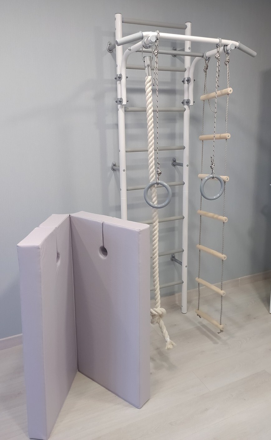 Турник настенный с навесным оборудованием белый Лестница веревочная, канат, кольца гимнастические