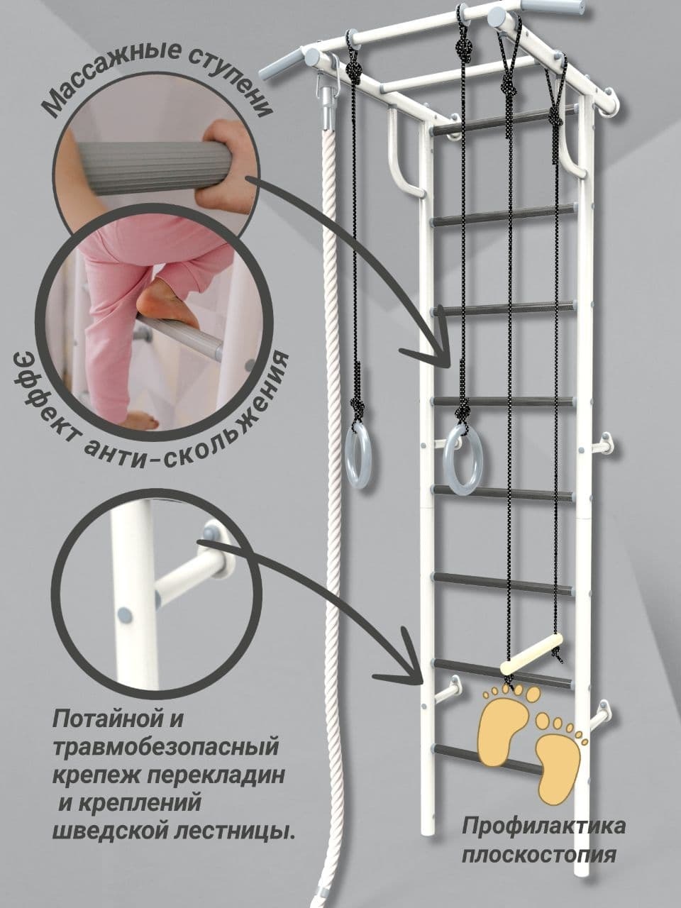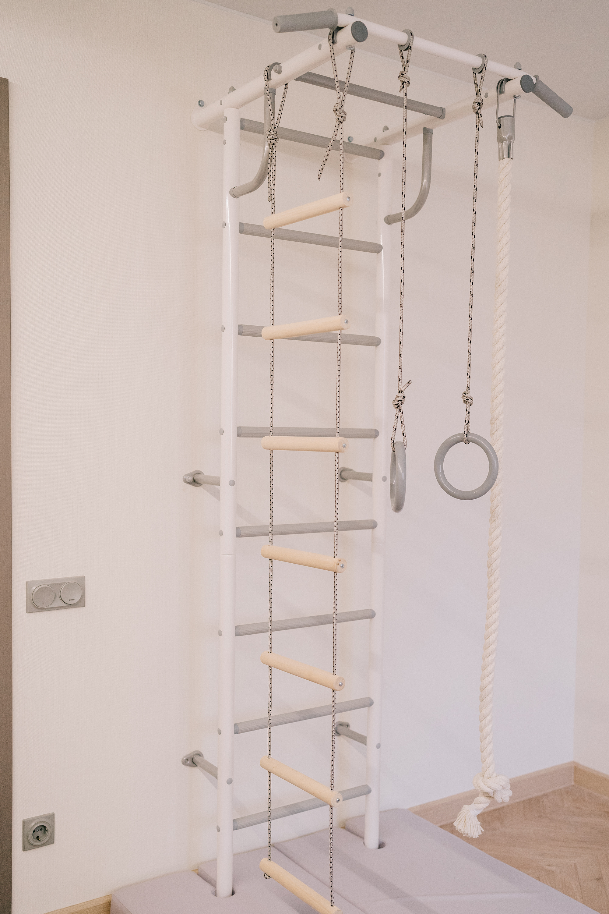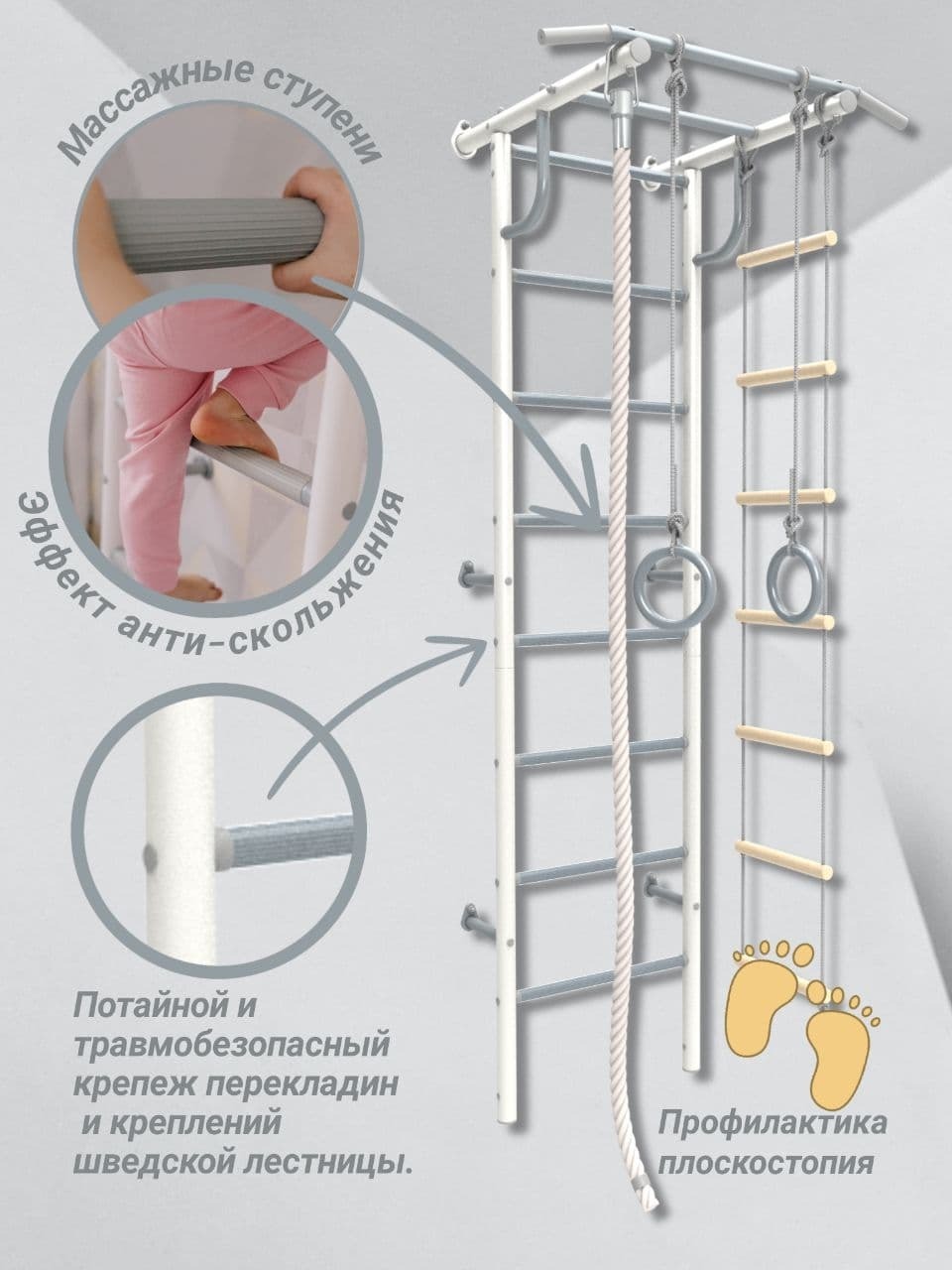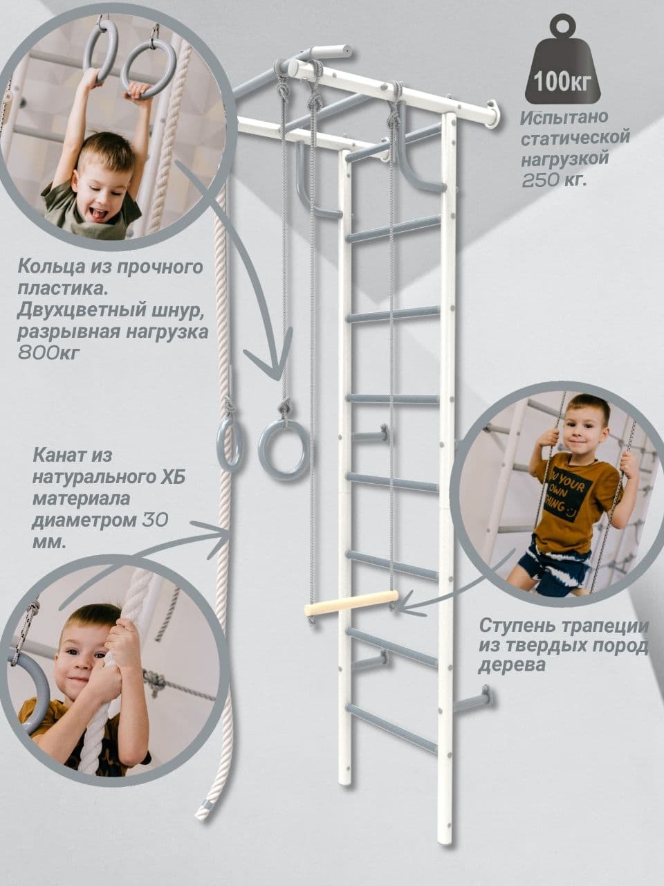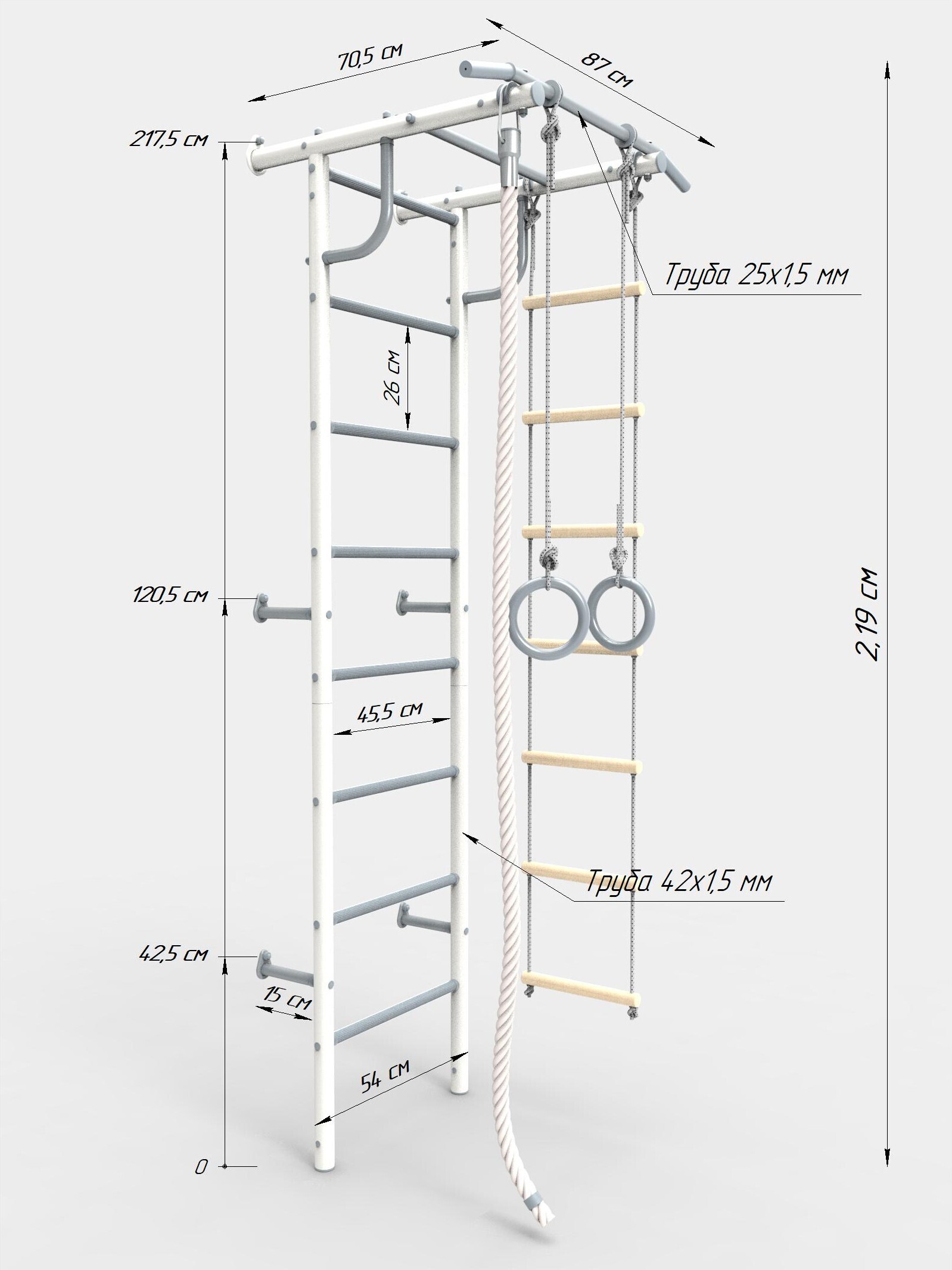 Турник настенный с навесным оборудованием белый Лестница веревочная, канат, кольца гимнастические
