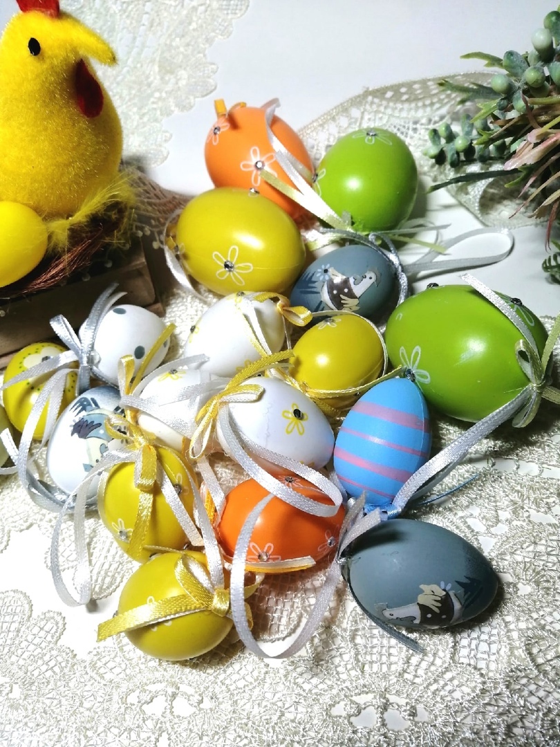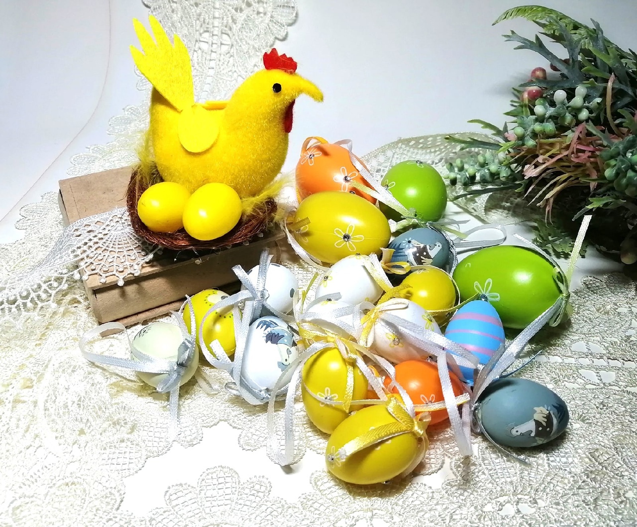 Набор пасхального декора для украшения в Пасху (курочка с яйцами в гнезде и яйца в ассортименте)