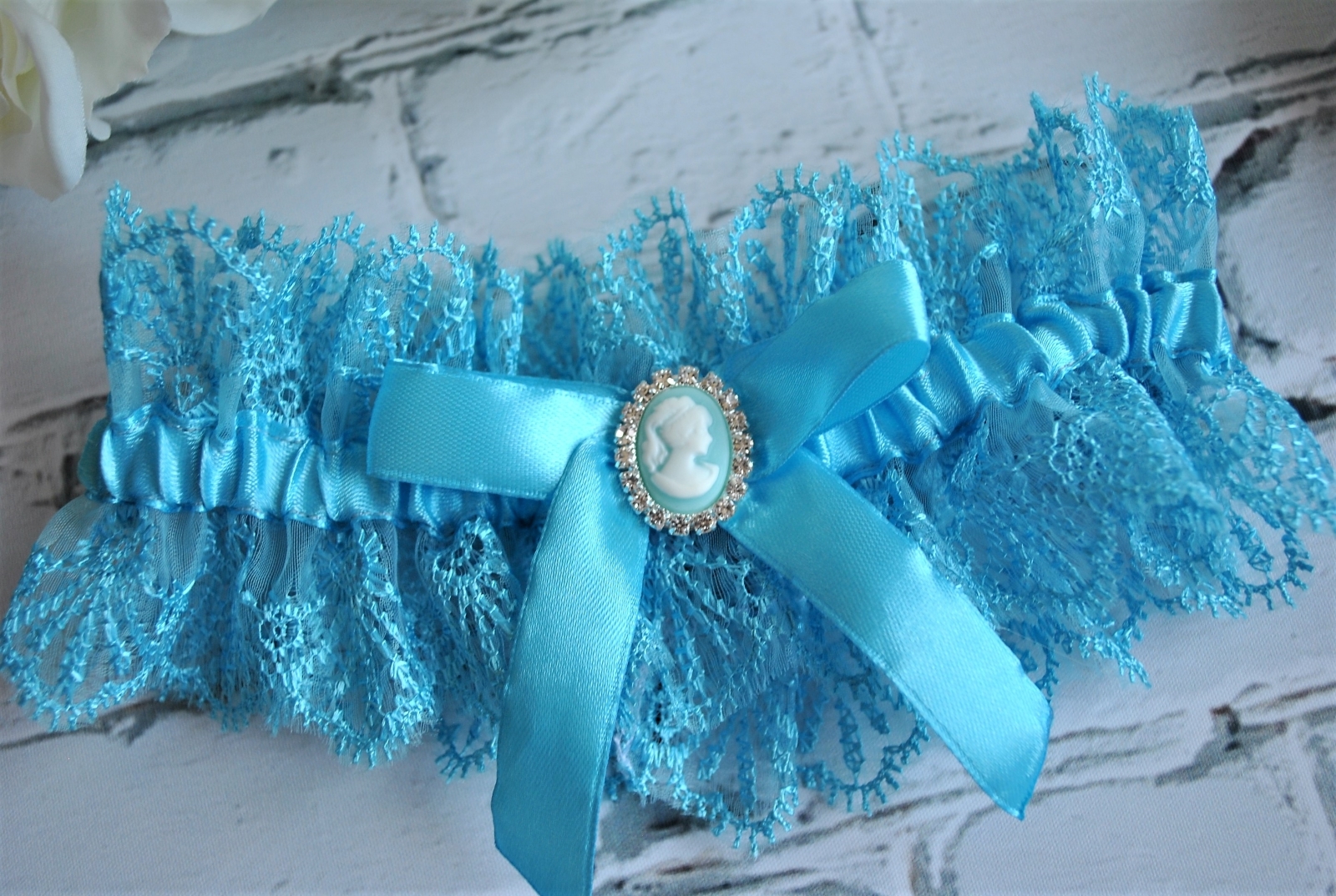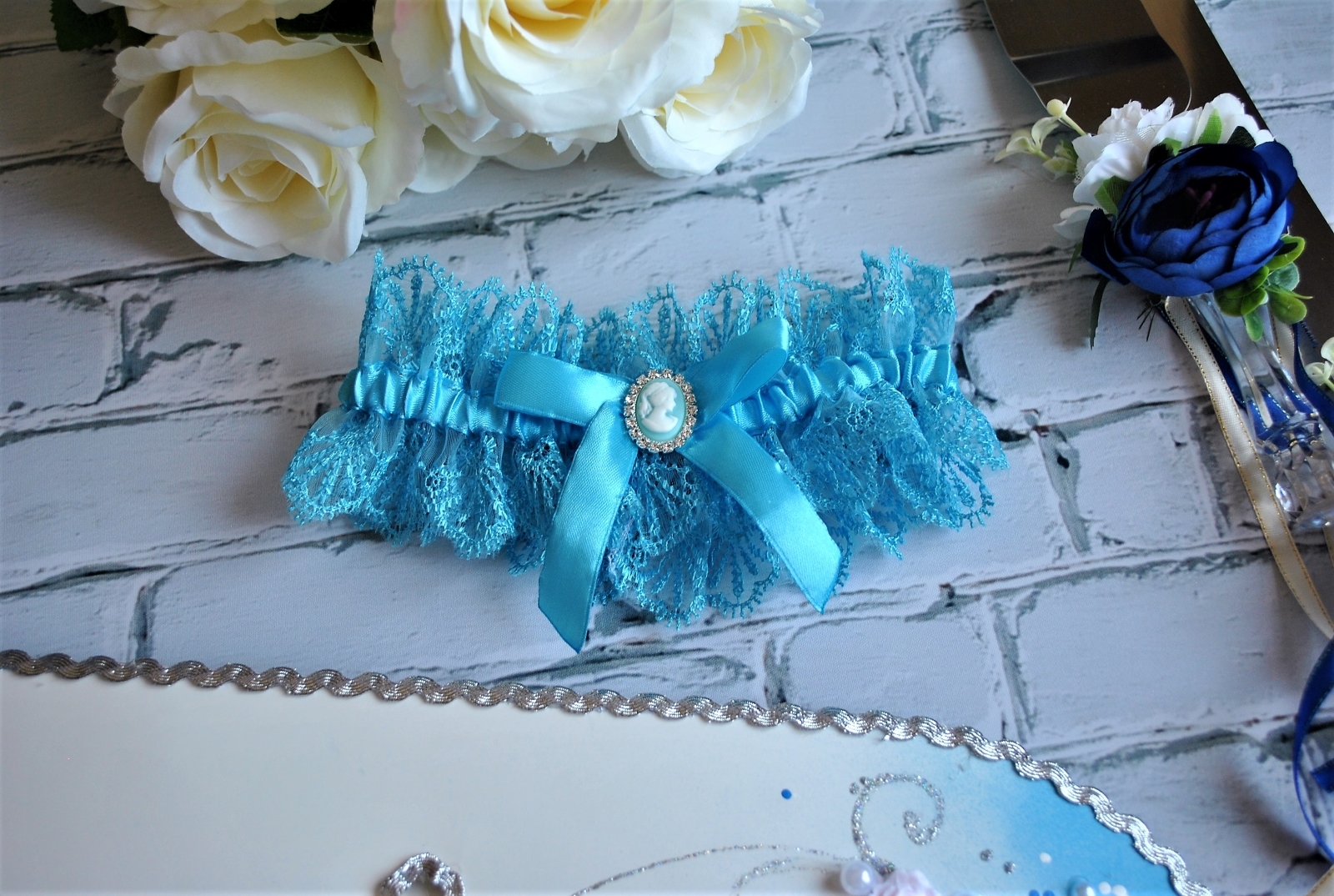 Подвязка для невесты ажурная, бирюзового цвета с бантиком и красивой камеей со стразами