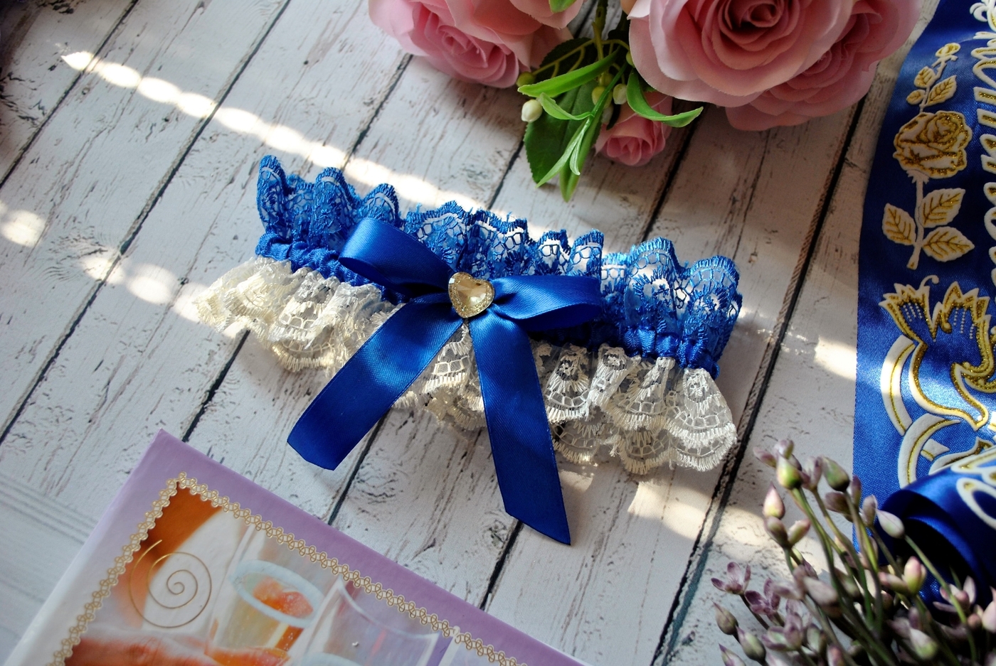 Подвязка для невесты с бантиком и кабошоном в виде сердечка "синий-айвори"