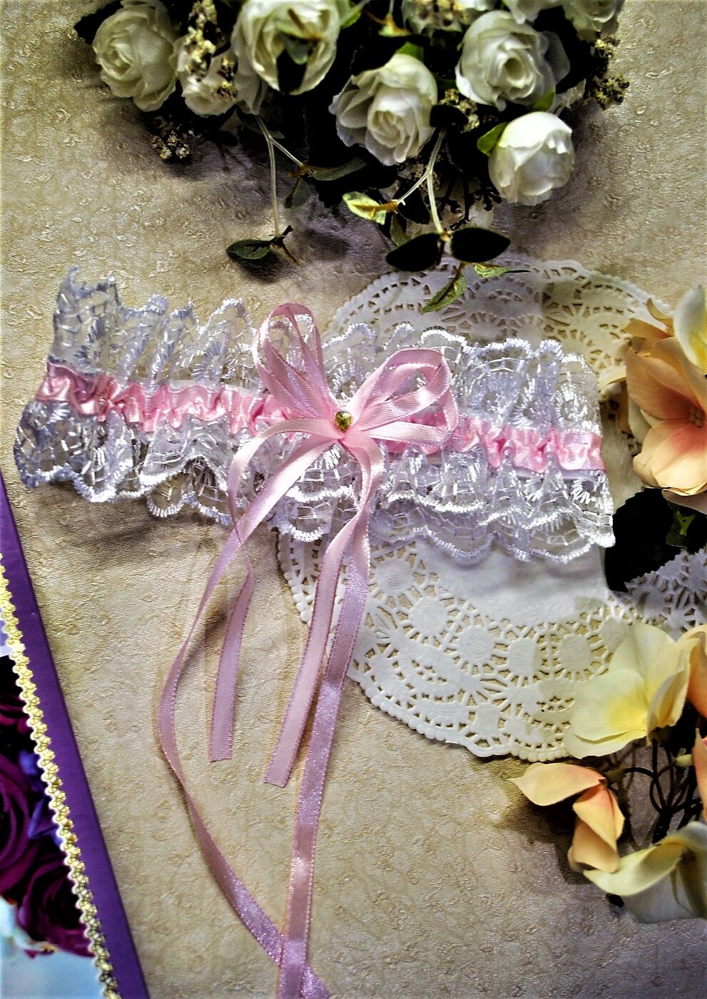 Подвязка невесты свадебная из белого кружева с розовой атласной лентой