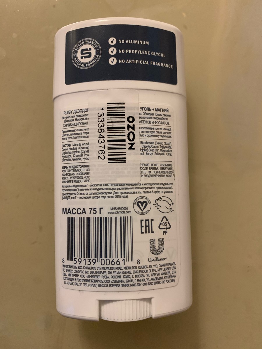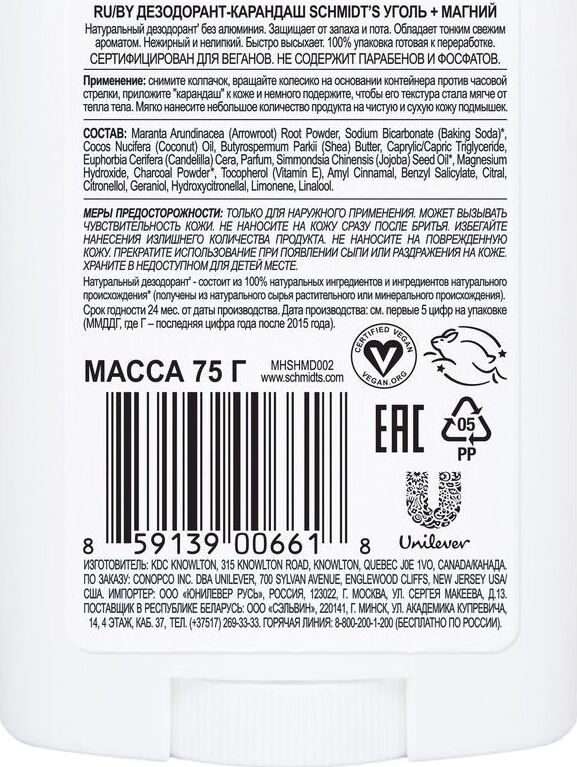 Дезодорант-карандаш Schmidt's Уголь + Магний, 75 г