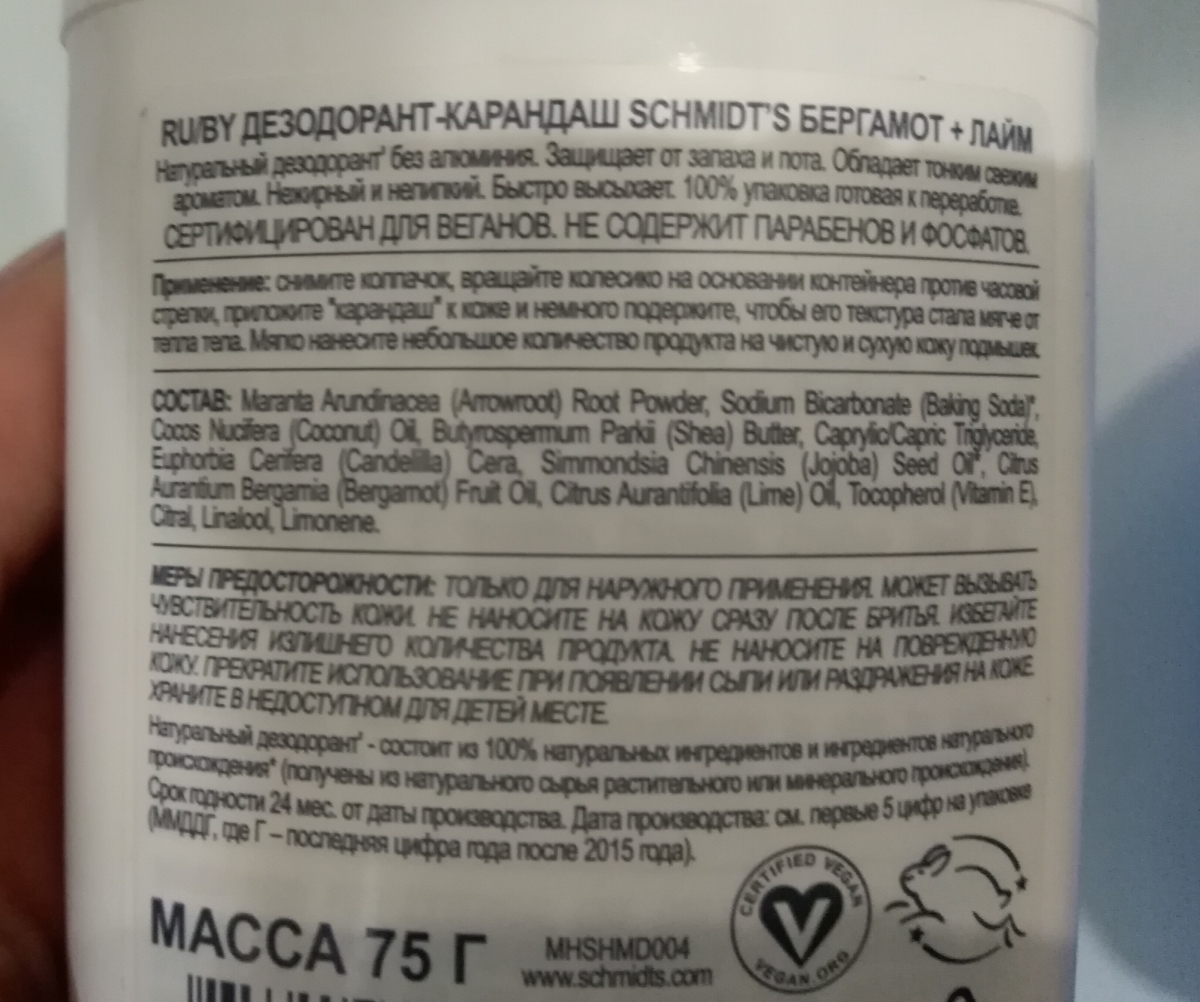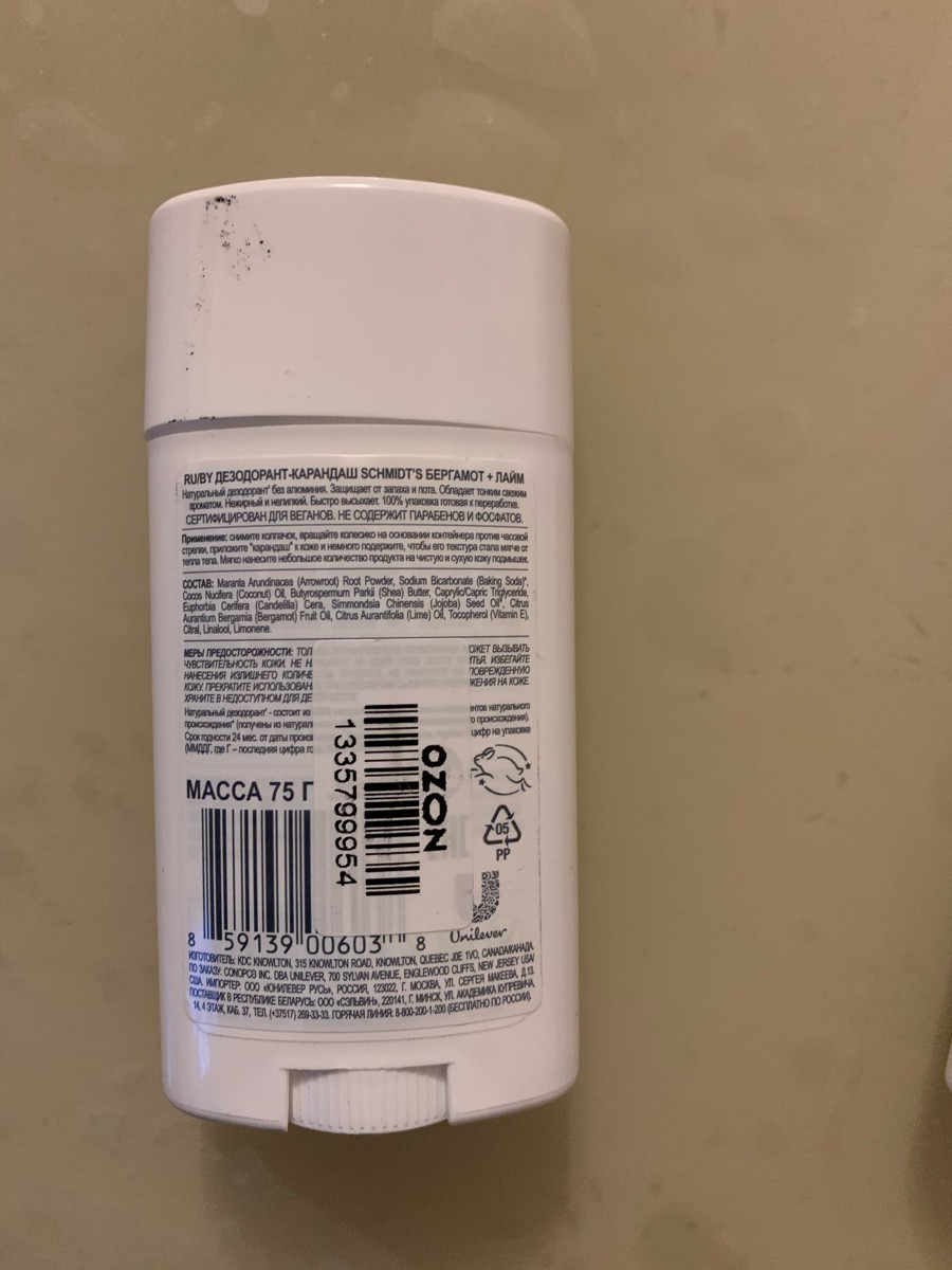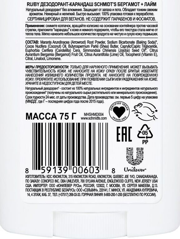Дезодорант-карандаш Schmidt's Бергамот + Лайм, 75 г