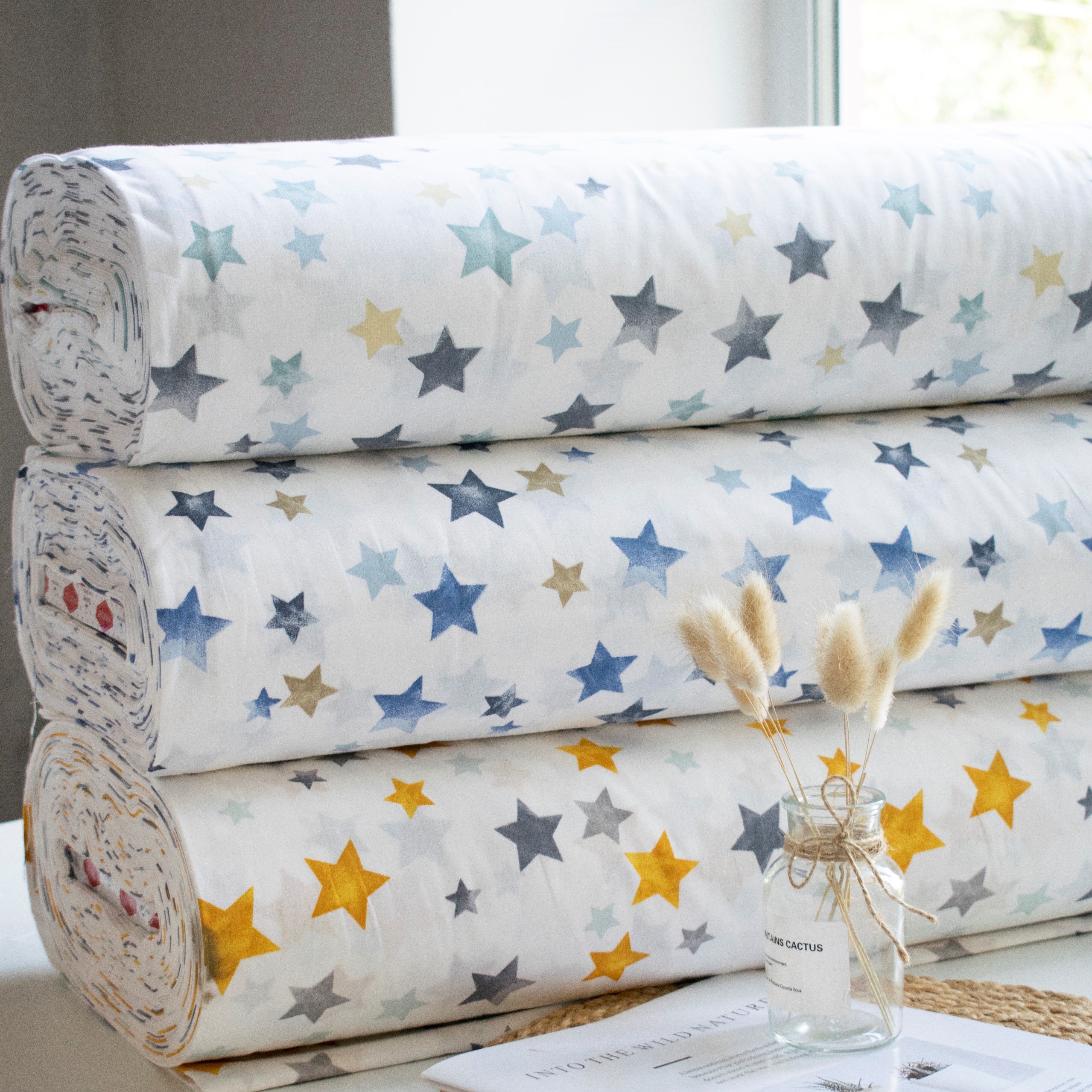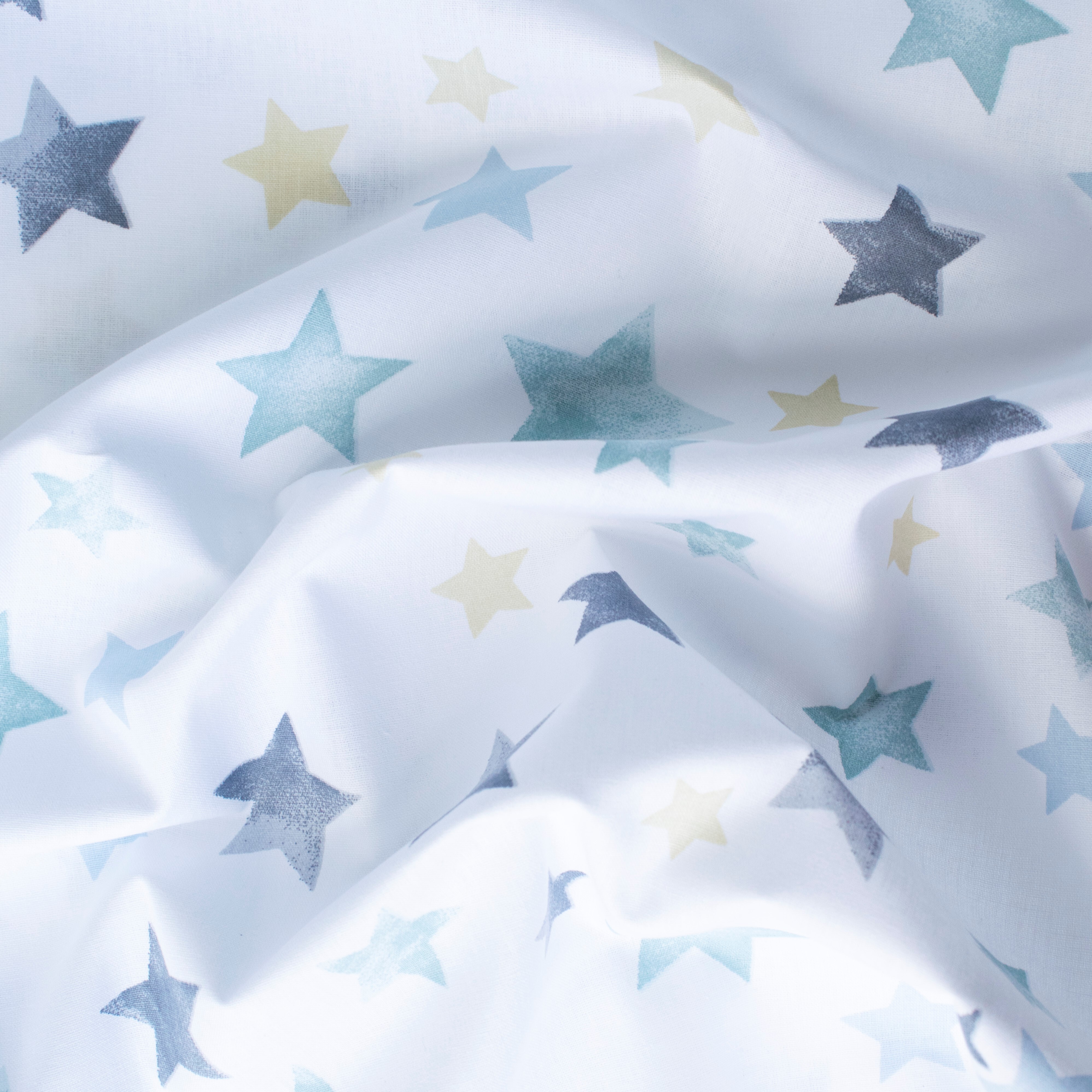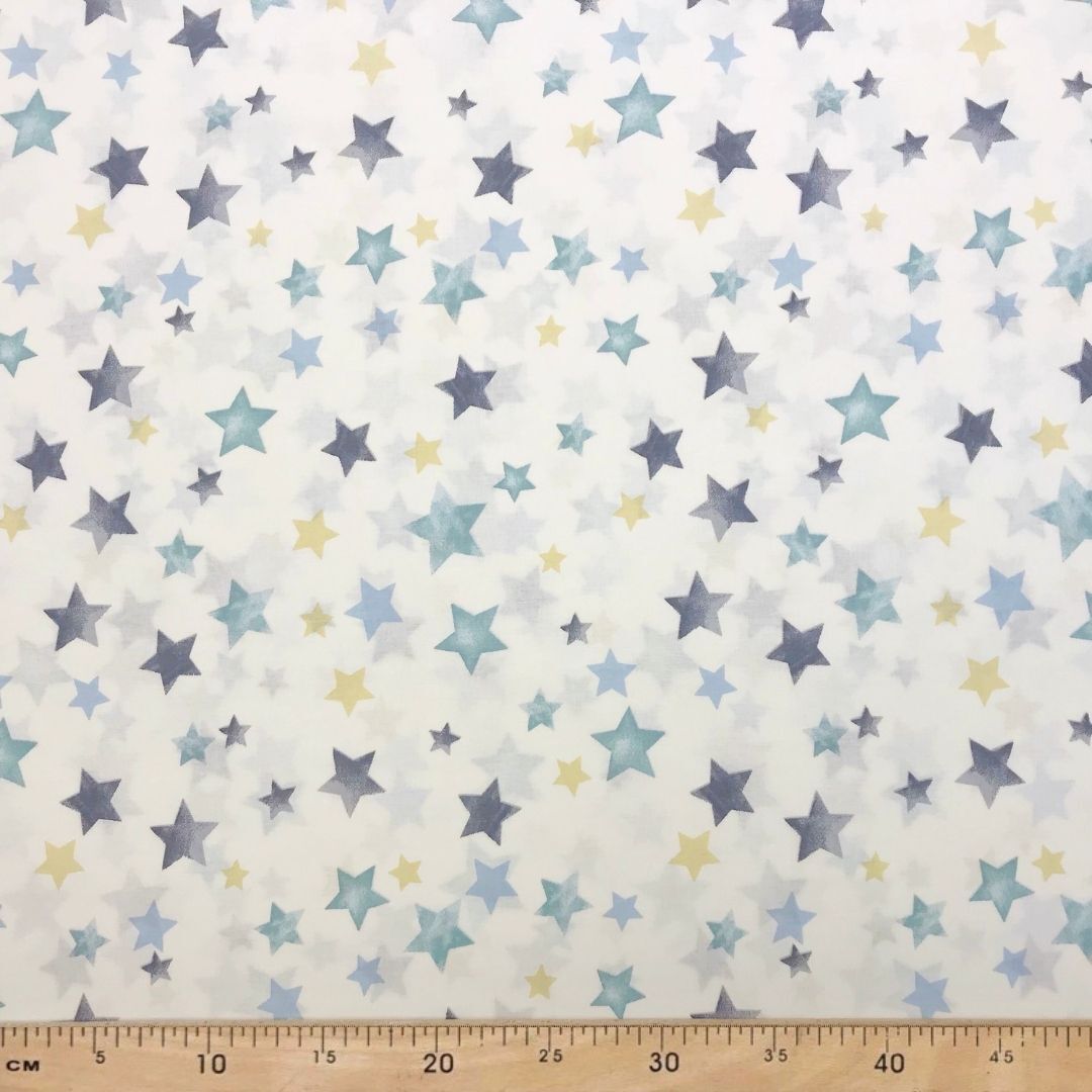 Ткань Люкс Ранфорс (Поплин). 100% хлопок, Бирюзовые и серые звёзды на белом. 100х240 см