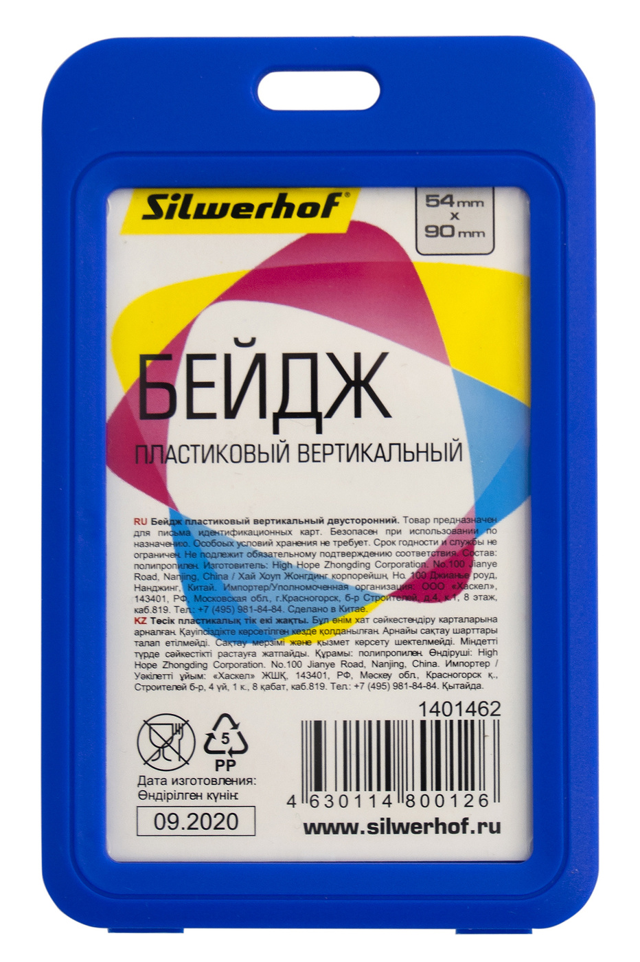 Бейдж Silwerhof 1401462 54х90мм вертикальный, без шнурка, полипропилен, синий.