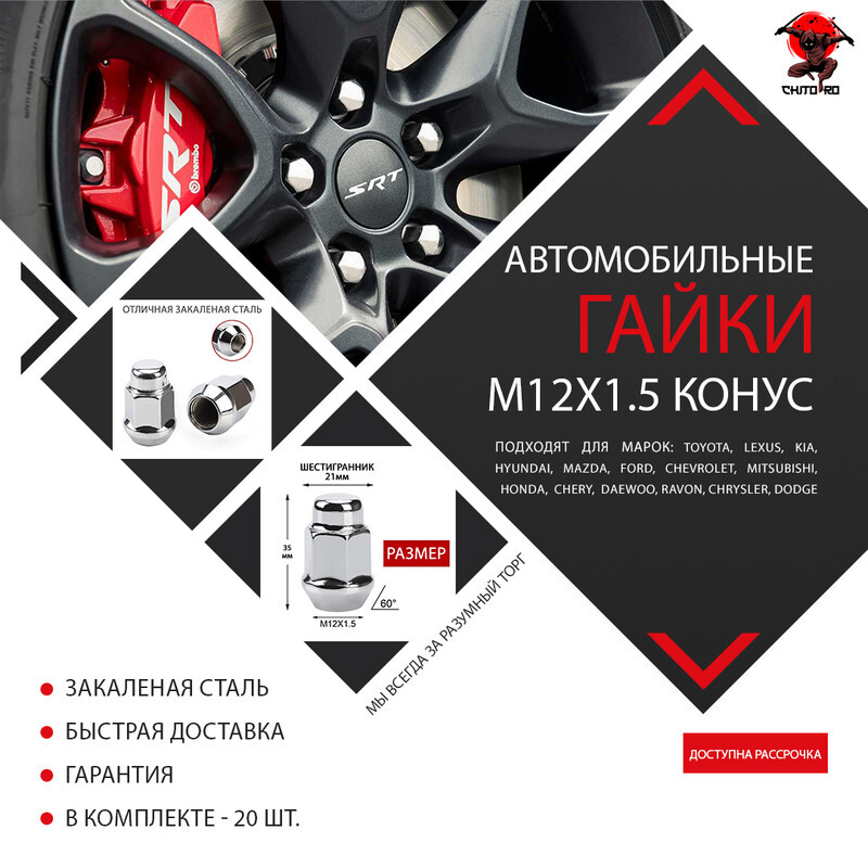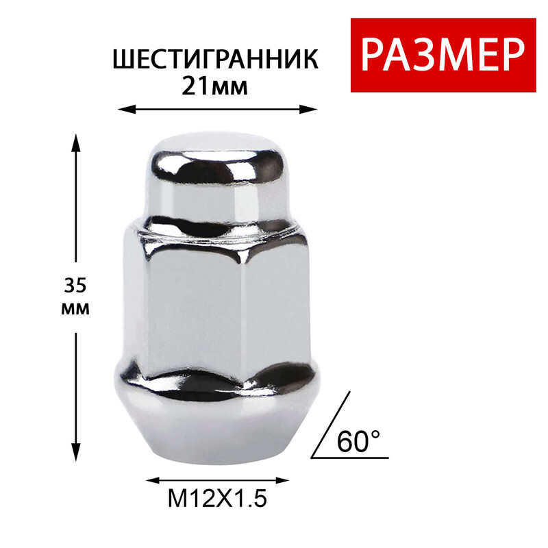 Гайки-секретки, Гайка крепежная автомобильная М12 х 1,5 35 21 мм, 20 шт.