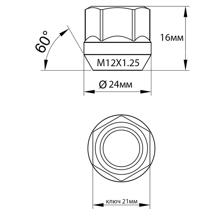 Гайки-секретки, Гайка крепежная автомобильная М12 х 1,25 16 21 мм, 20 шт.