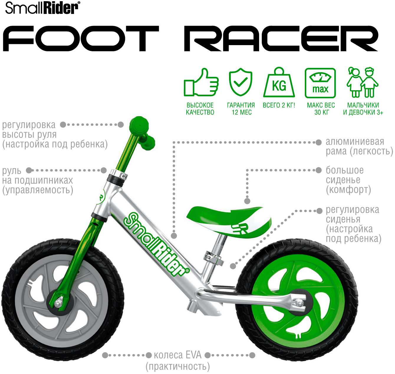 Алюминиевый беговел 12' Small Rider Foot Racer 3 (EVA, Серебро-зеленый)