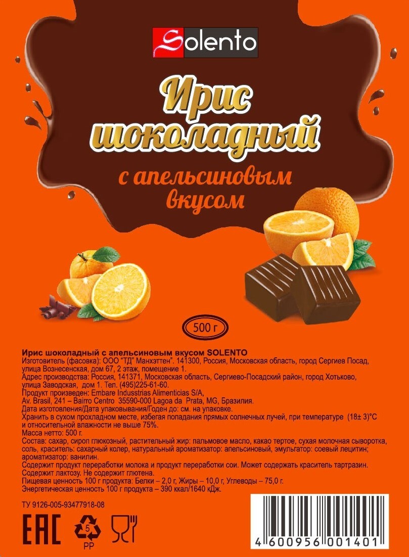 Ирис шоколадный с апельсиновым вкусом, 500 г, SOLENTO, без глютена