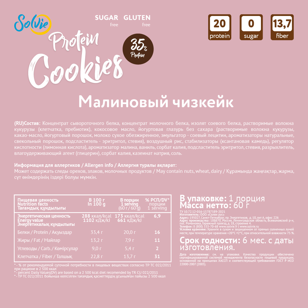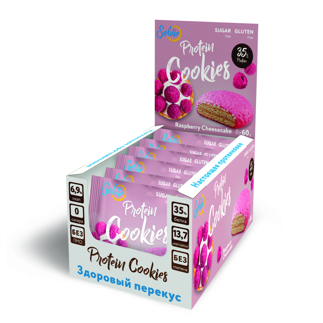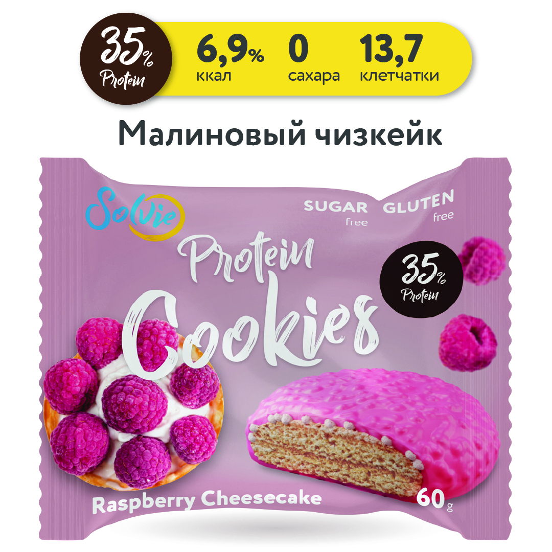 Solvie / Протеиновое печенье/35% белка/без сахара/ 8шт в йогуртовой глазури малиновый чизкейк