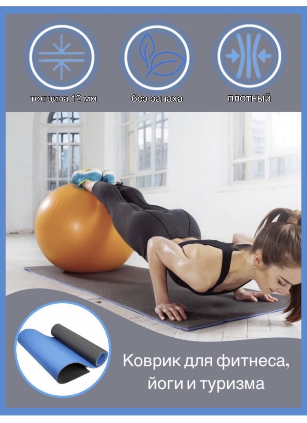 Коврик для фитнеса / пилатеса / йоги 12 мм 180*60 см Синий-черный