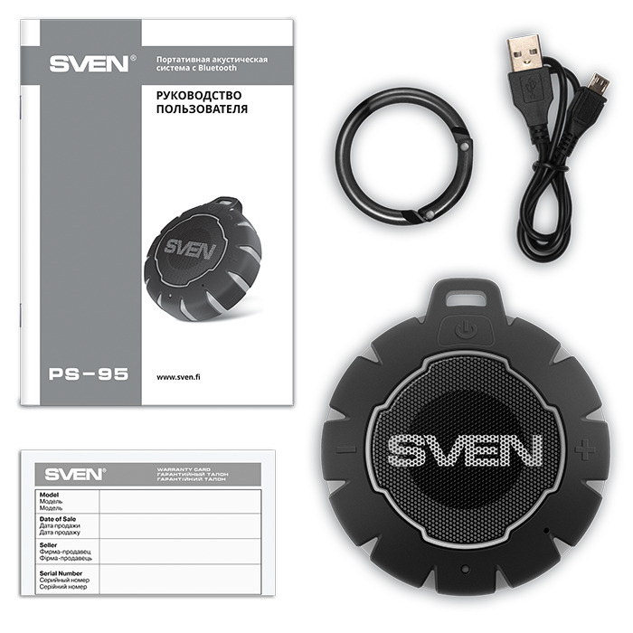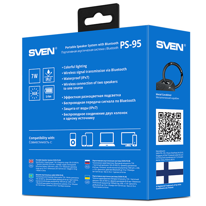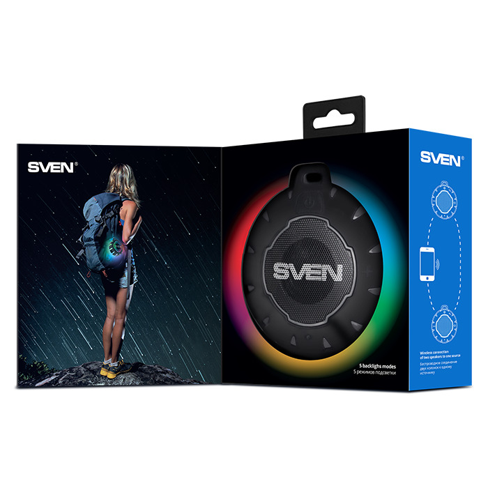 Колонка портативная SVEN PS-95, черный/ 7 Вт/ Waterproof (IPx7)/ TWS/ Bluetooth/ 1000мА*ч