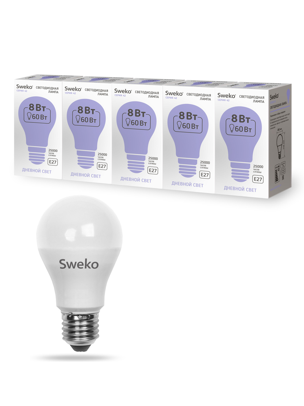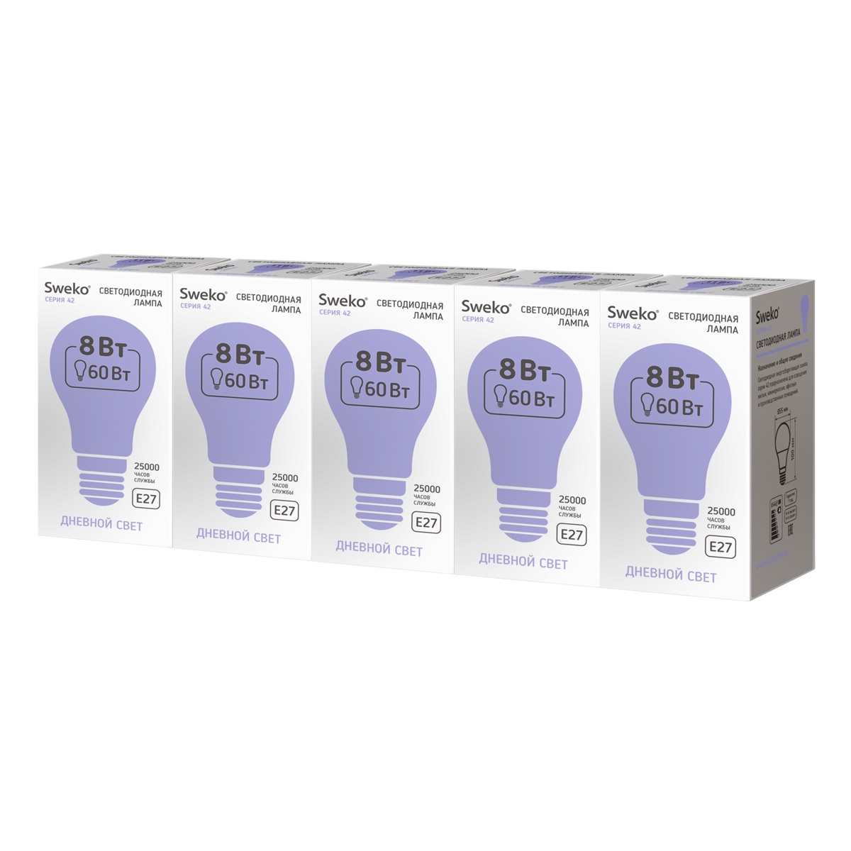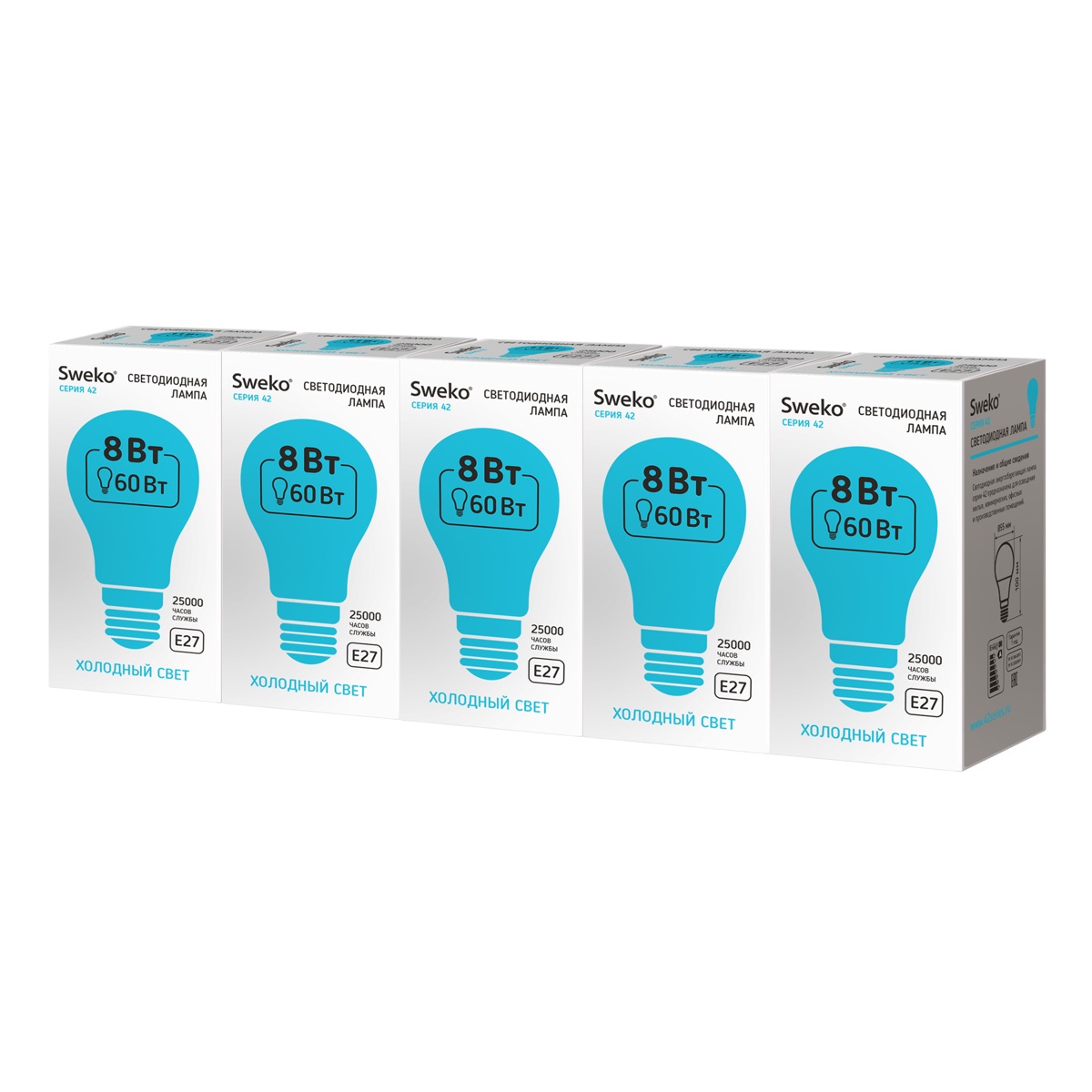 Лампочка Sweko E27, A55, 8Вт 6500К 42LED (упаковка 5 шт), Холодный белый свет, Светодиодная, 5 шт.