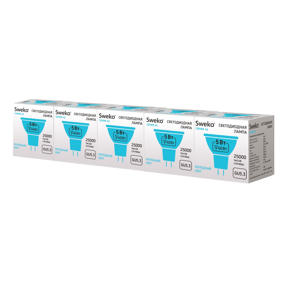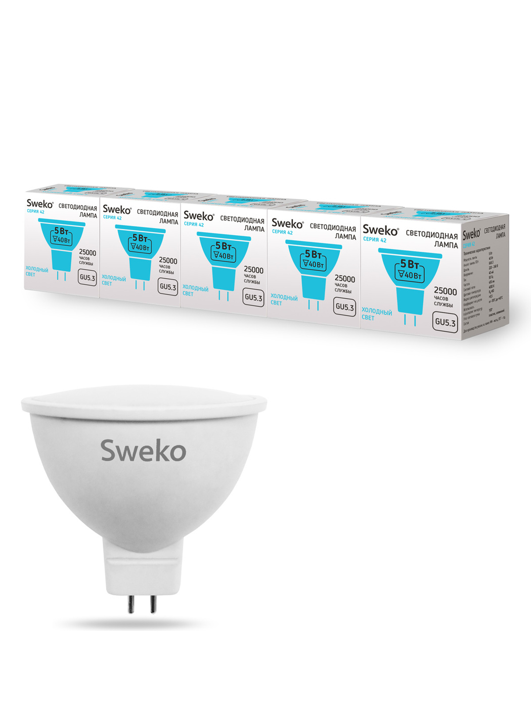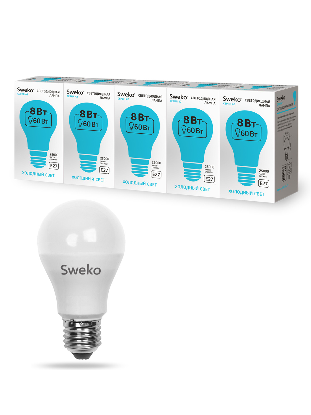 Лампочка Sweko E27, A55, 8Вт 6500К 42LED (упаковка 5 шт), Холодный белый свет, Светодиодная, 5 шт.
