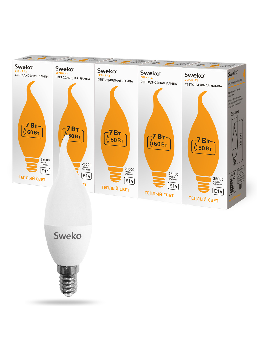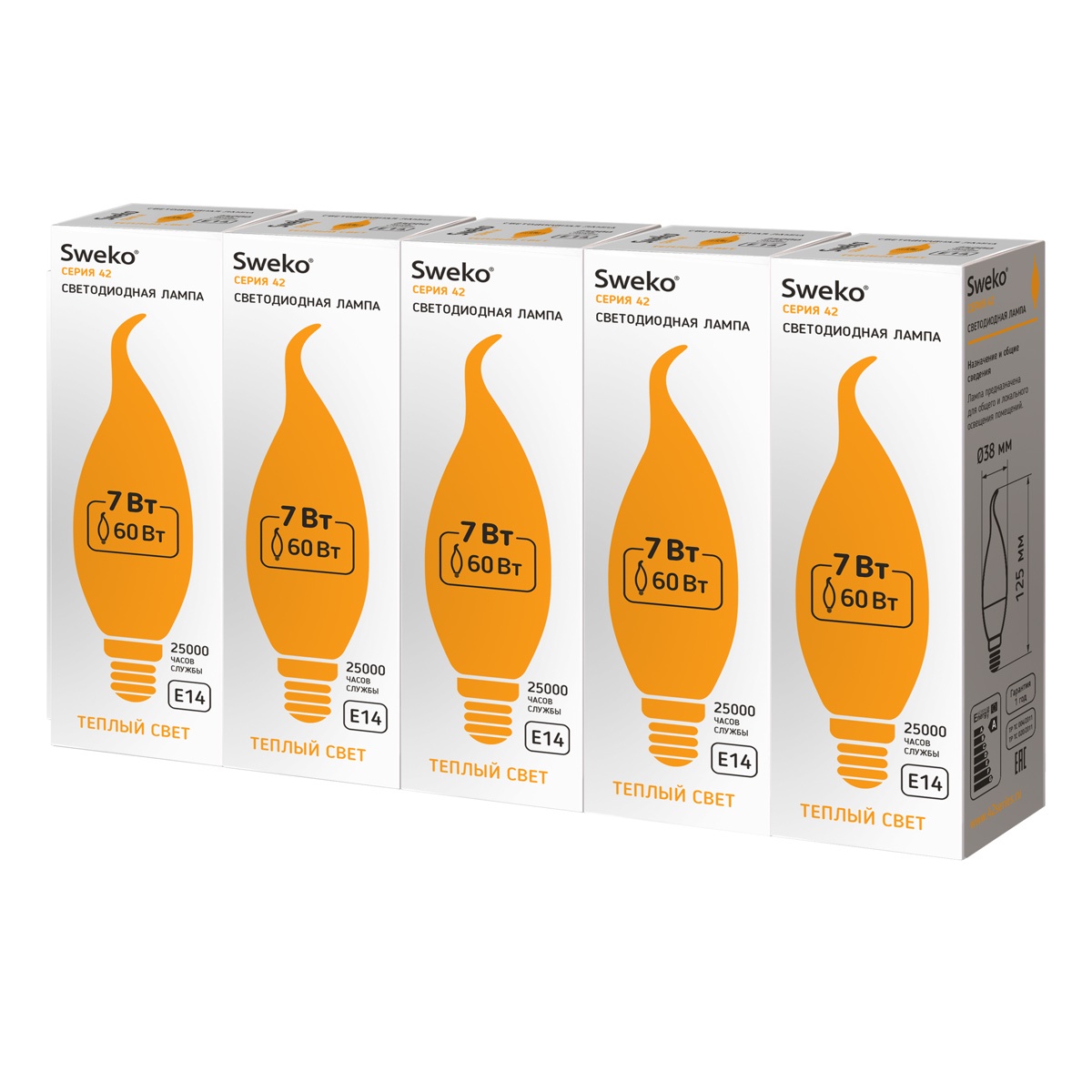 Лампочка Sweko E14, C35, 5Вт 3000K 42LED (упаковка 5 шт), Теплый белый свет, Светодиодная, 5 шт.