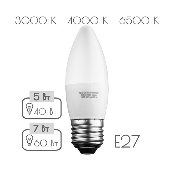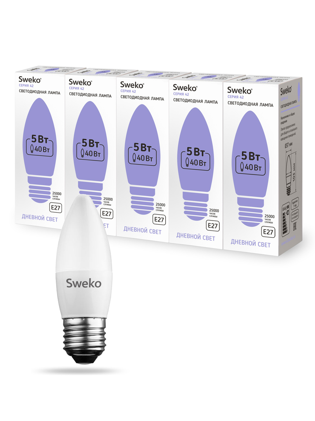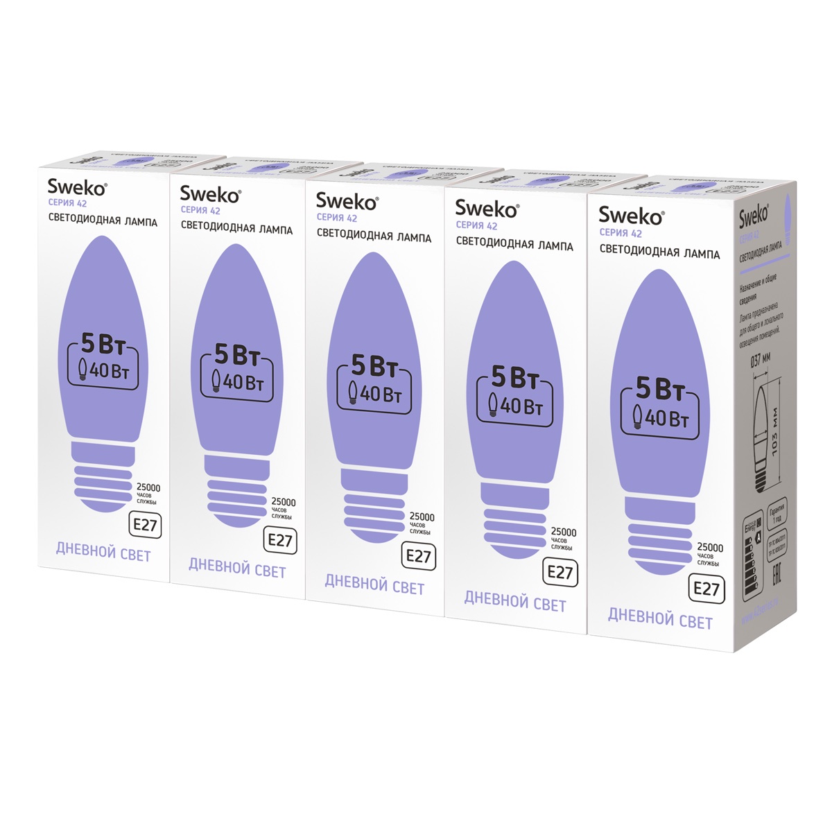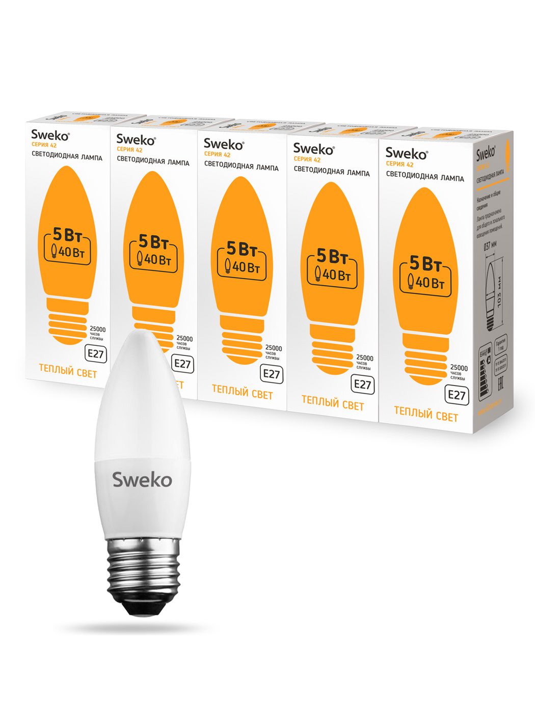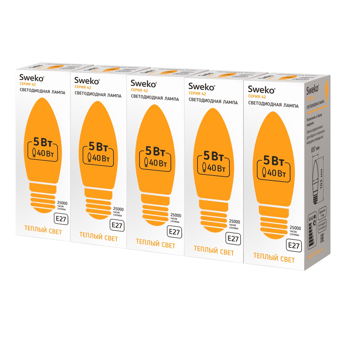 Лампочка Sweko E27, C35, 5Вт 3000K 42LED (упаковка 5 шт), Теплый белый свет, Светодиодная, 5 шт.
