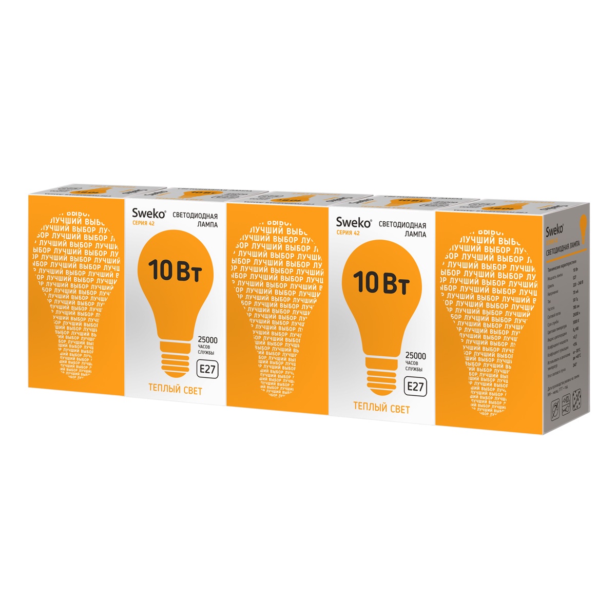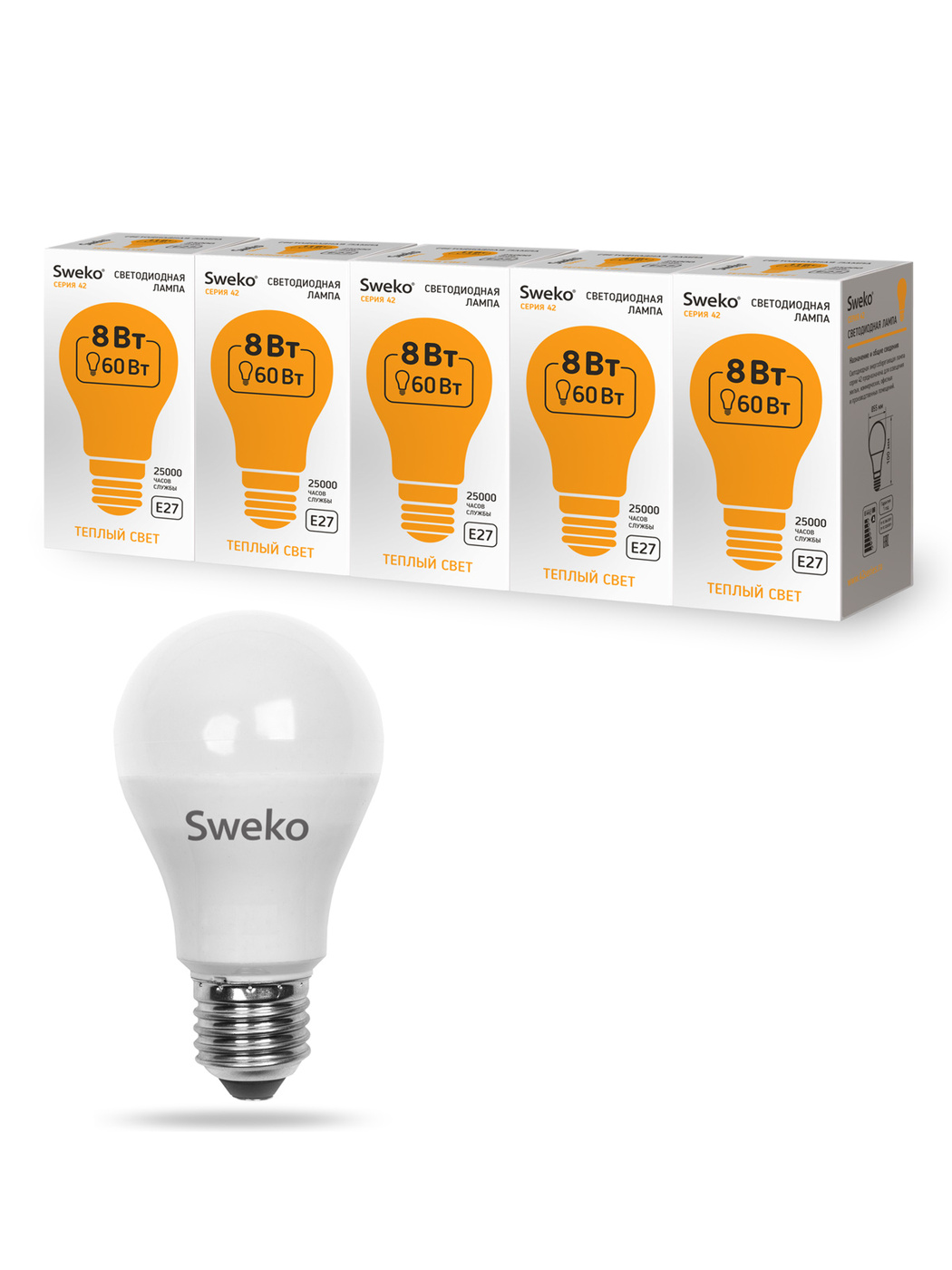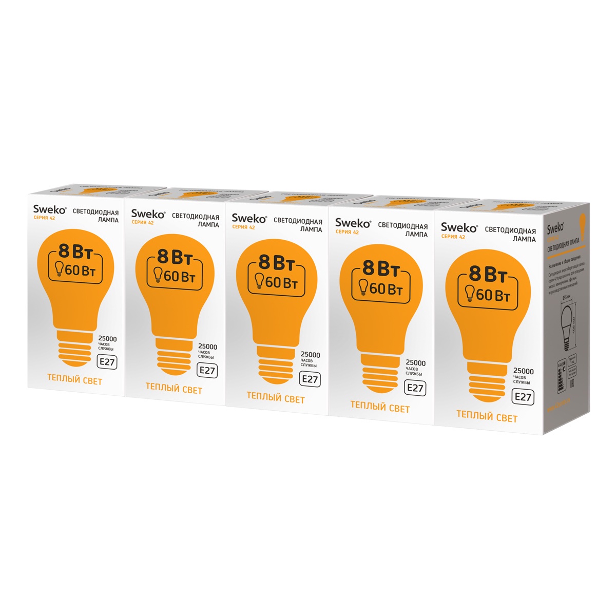 Лампочка Sweko E27, A55, 8Вт 3000К 42LED (упаковка 5 шт), Теплый белый свет, Светодиодная, 5 шт.
