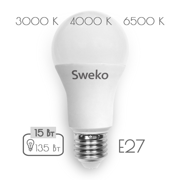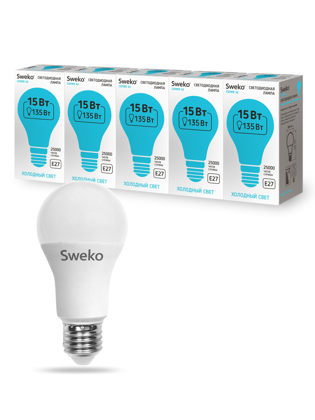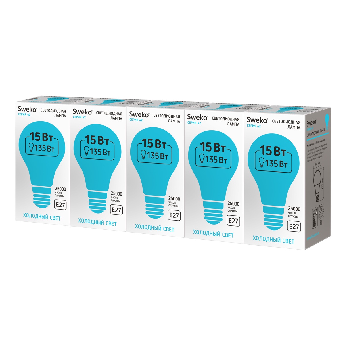 Лампочка Sweko E27, A60, 15Вт 4000К 42LED (упаковка 5 шт), Холодный белый свет, Светодиодная, 5 шт.