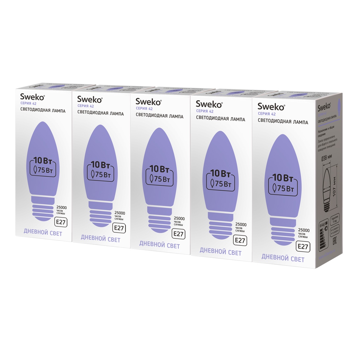 Лампочка Sweko E27, C35, 10Вт 6500K 42LED (упаковка 5 шт), Дневной белый свет, Светодиодная, 5 шт.