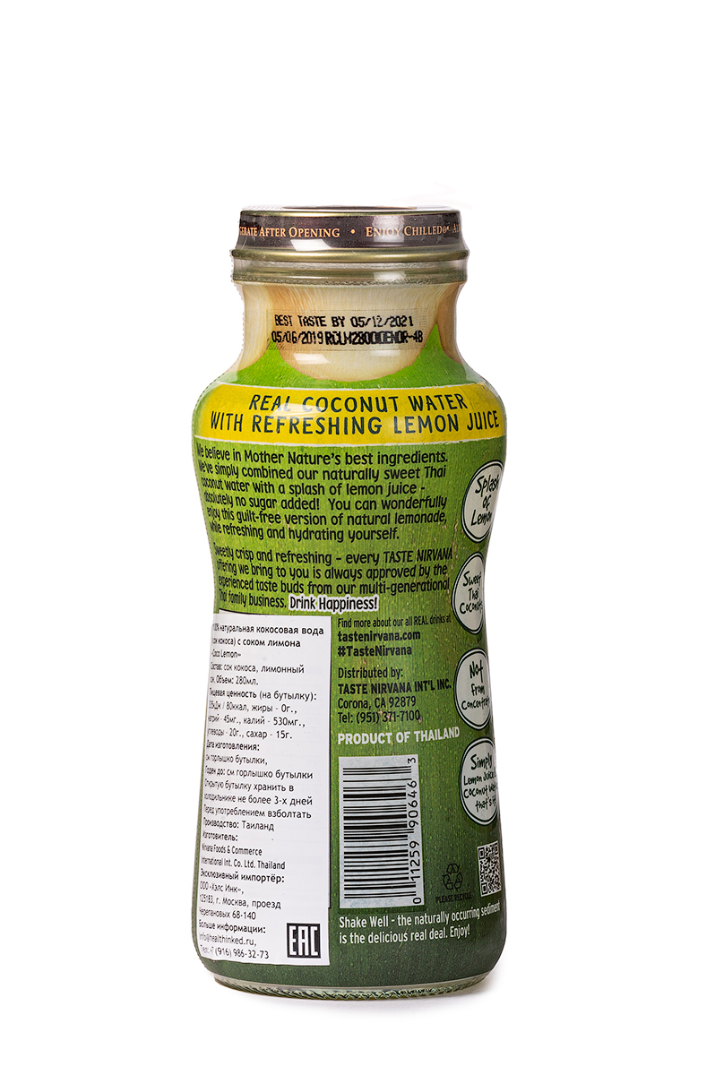 "кокосовая вода Taste Nirvana - 100% сок зеленого кокоса ""Coco Lemon"" с соком лимона, стекло"