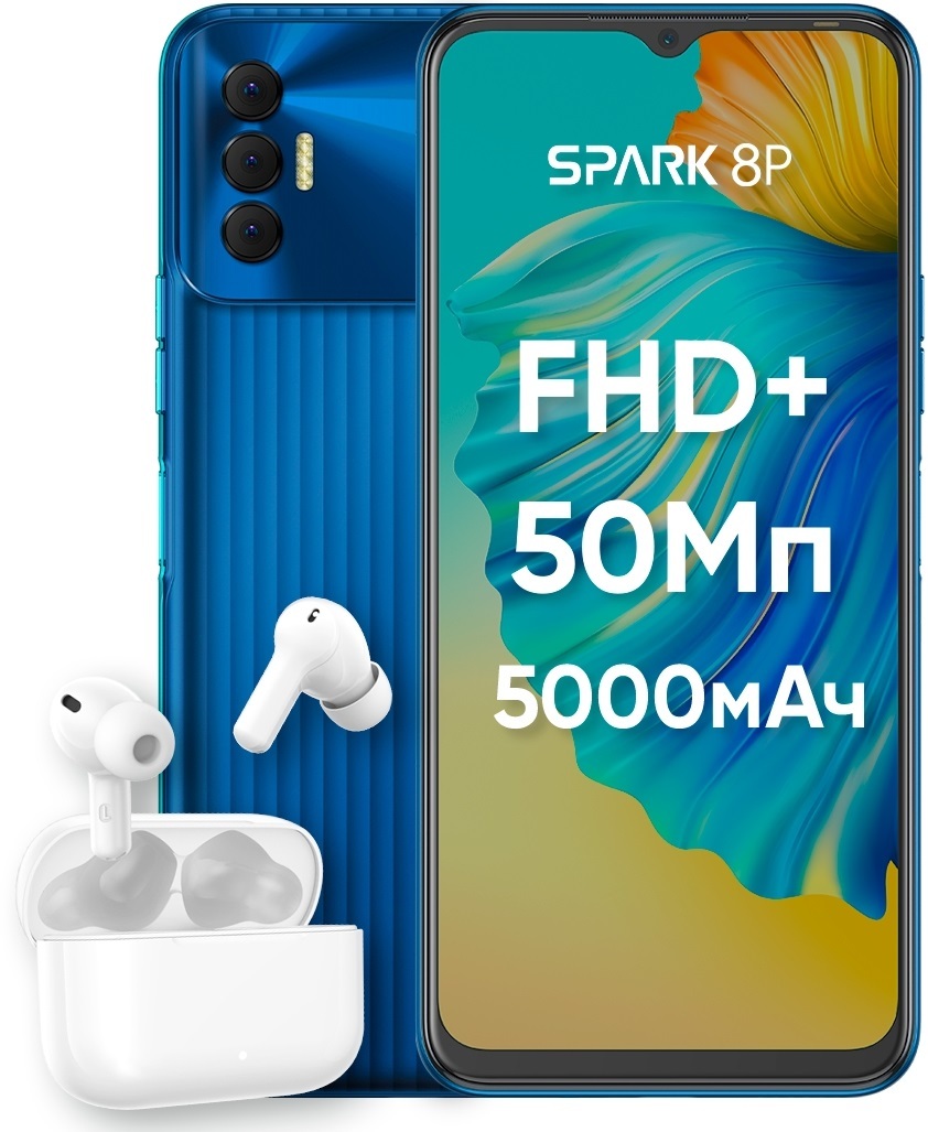Смартфон Tecno Spark 8P 4/64GB, синий + беспроводные наушники TECNO Buds1 BD1 белые