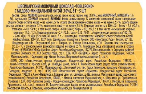 Шоколад Toblerone молочный с медом и миндальной нугой