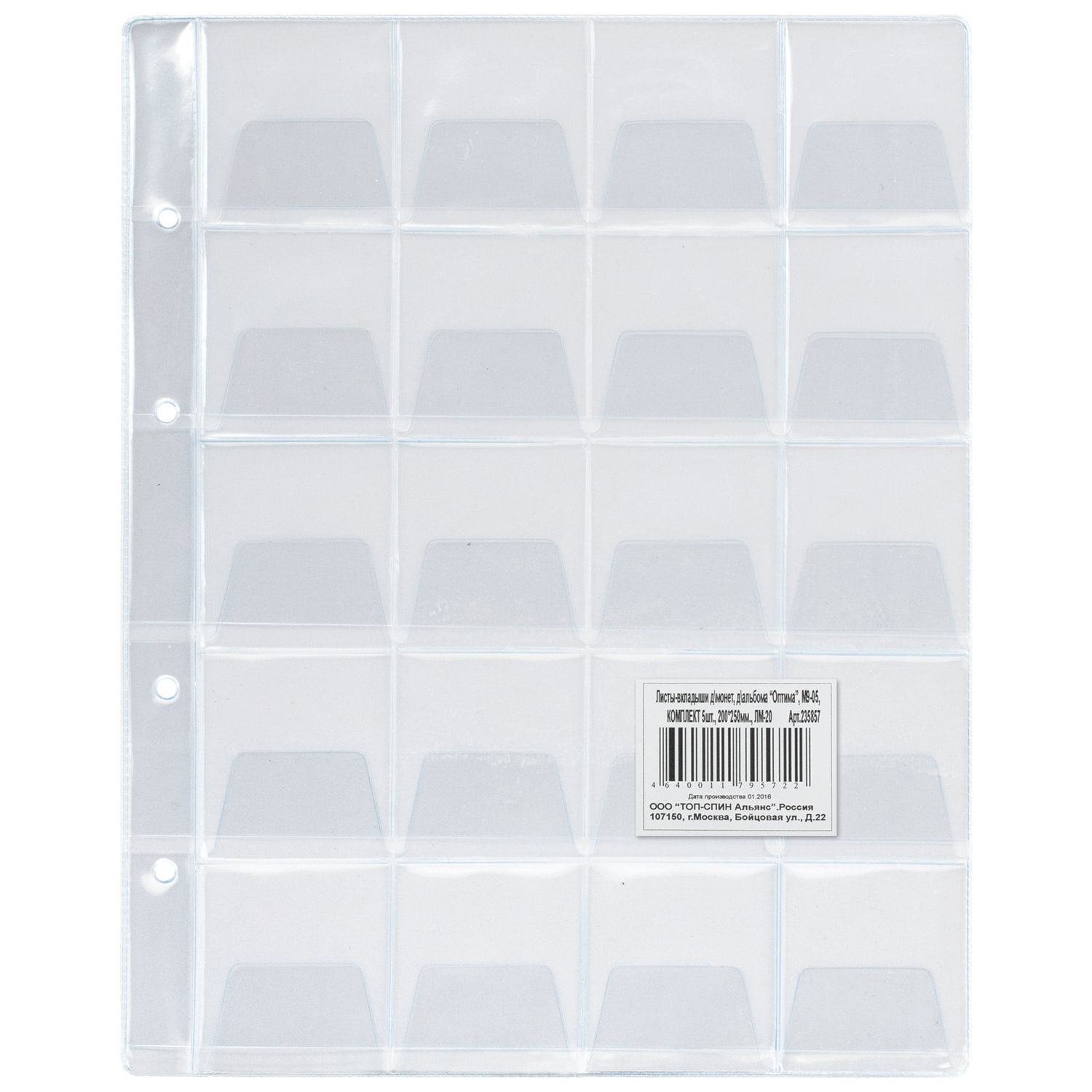 Листы-вкладыши для монет для альбома Оптима М9-05, комплект 5 шт., 200?250 мм, 20 карманов, ЛМ-20