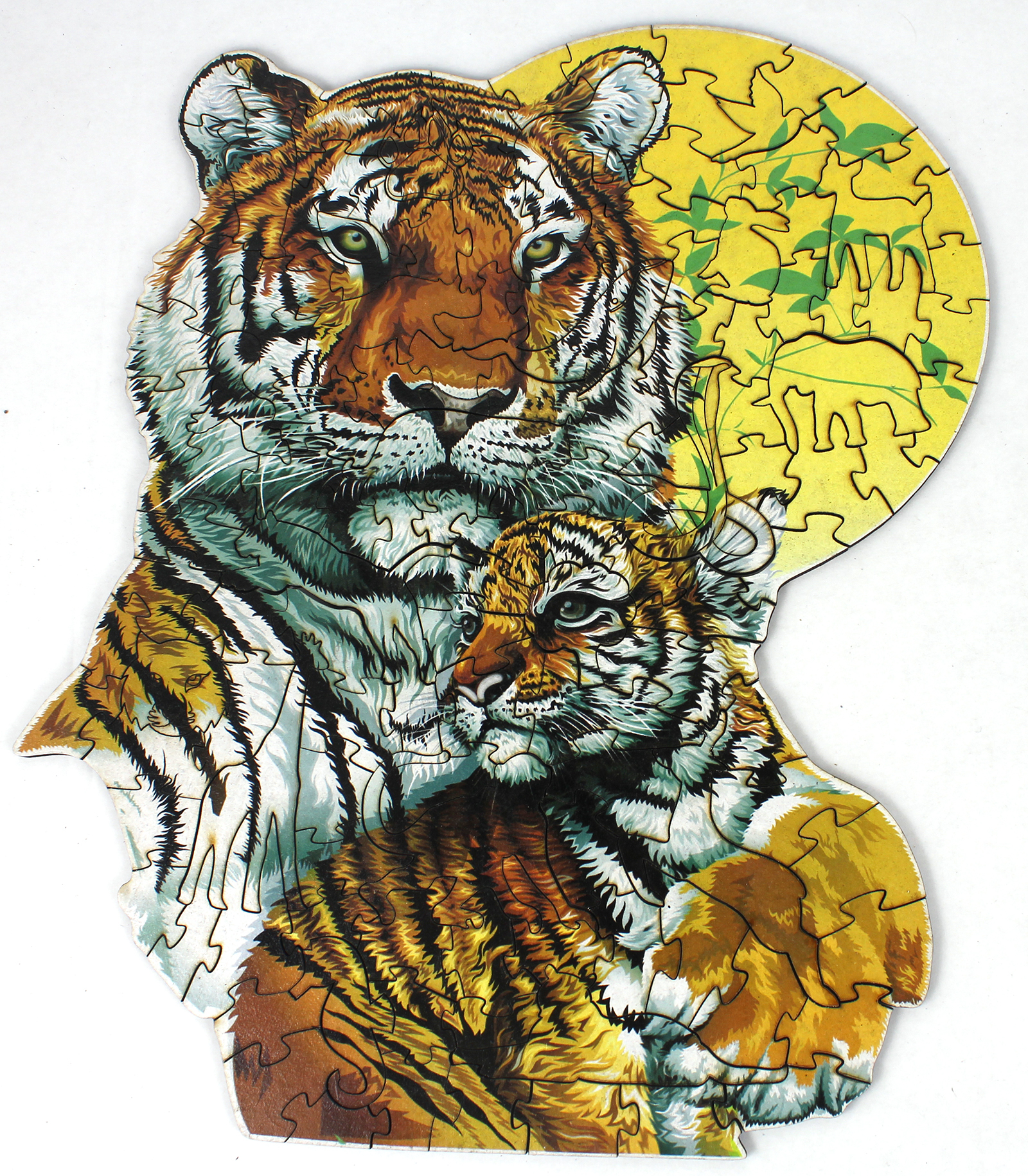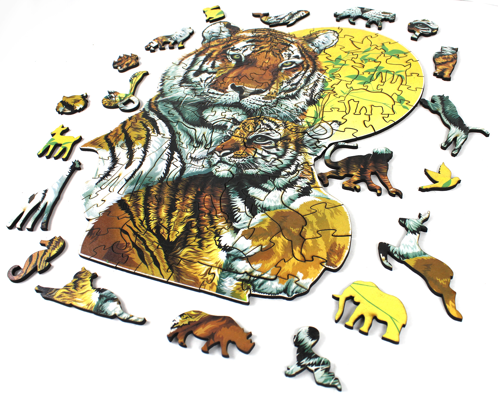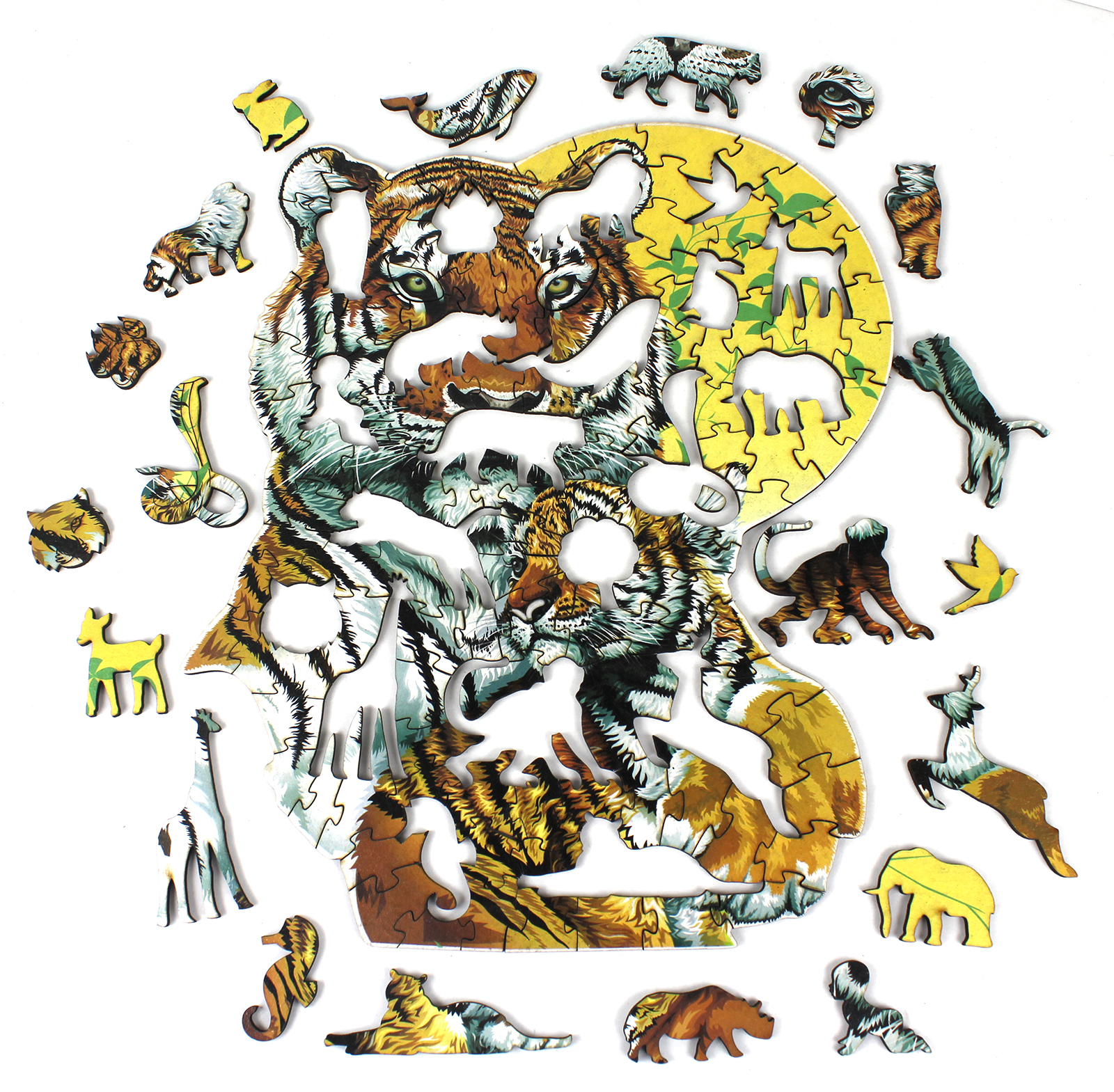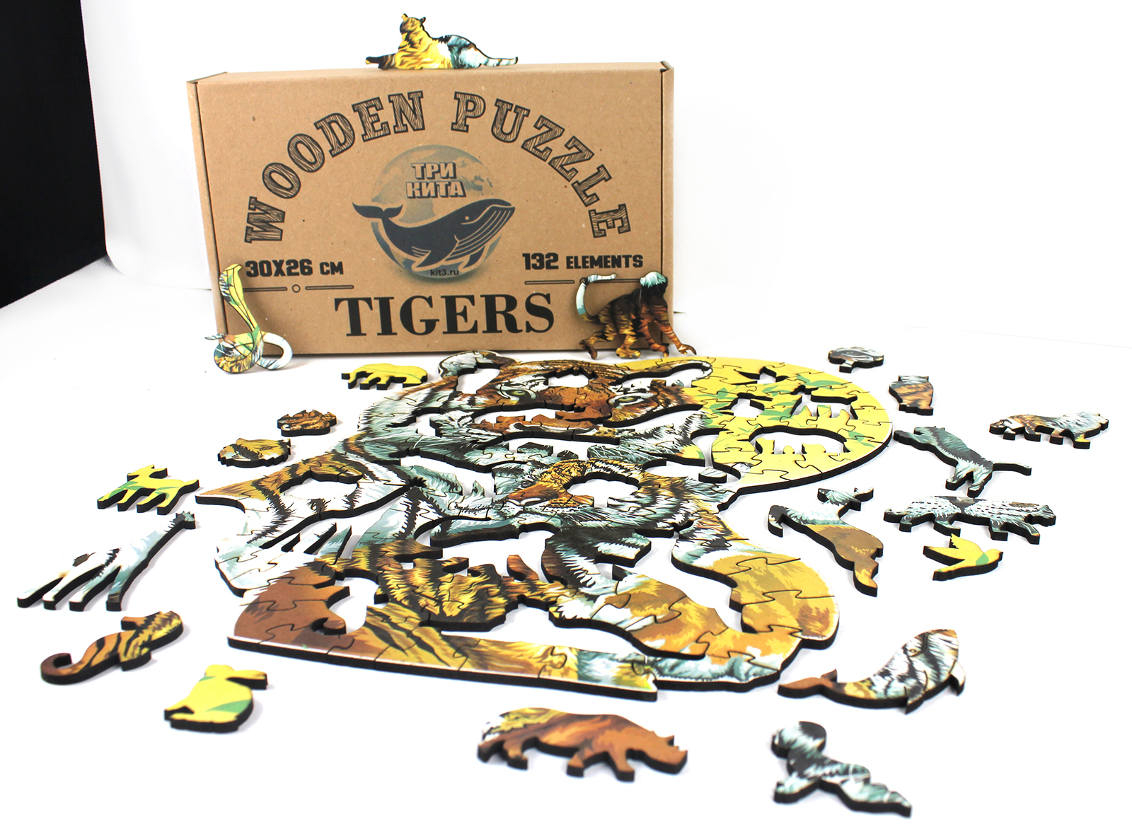 Большой деревянный фигурный пазл ТИГРЫ 132 детали 30х26см для детей и взрослых