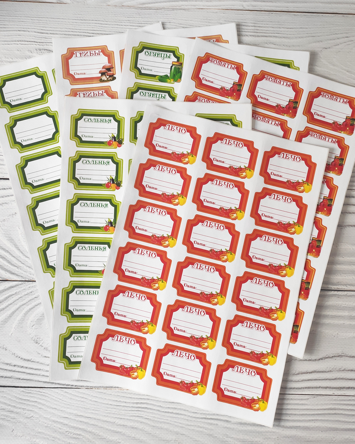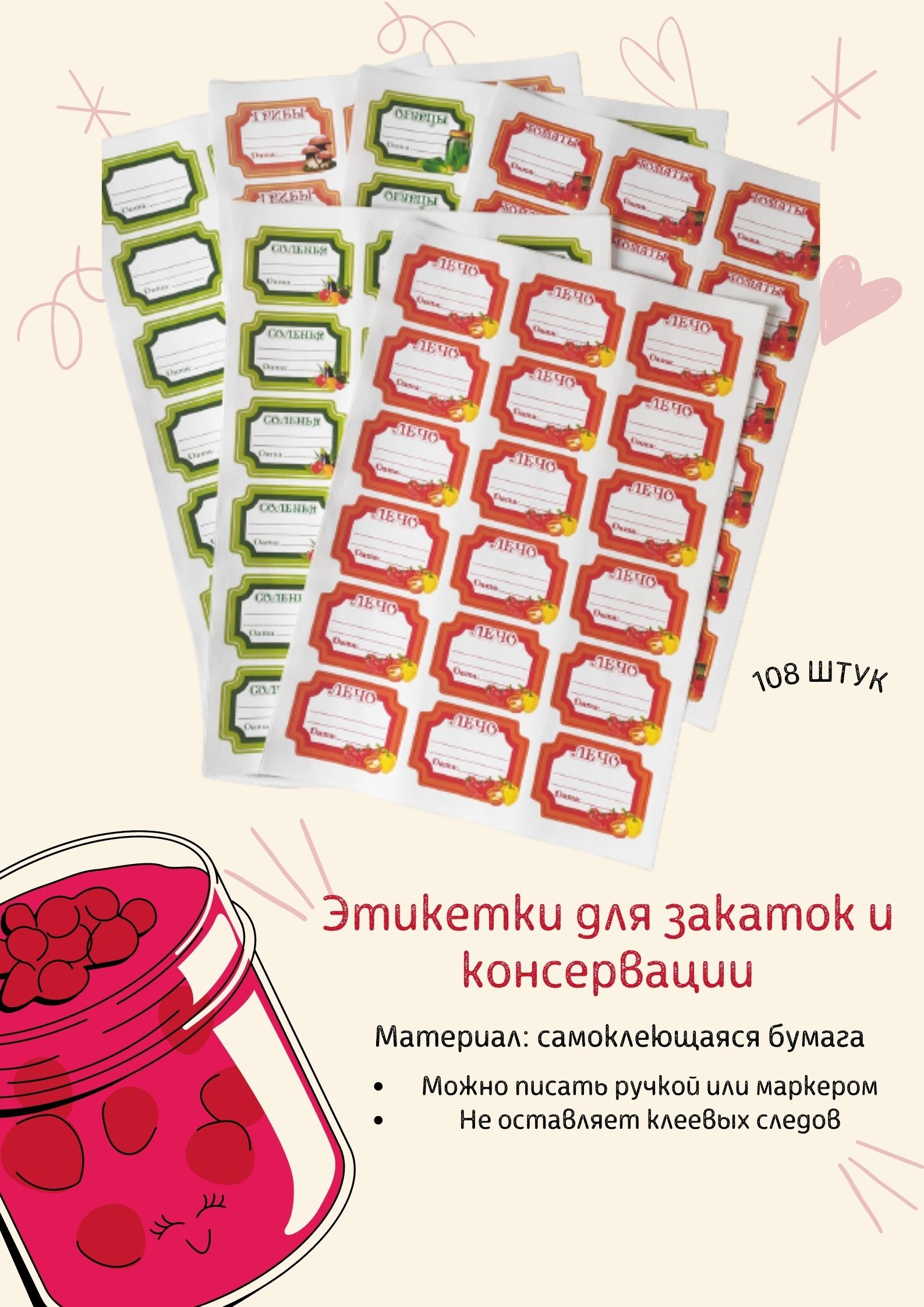 Наклейки, этикетки для банок, заготовок, консервации. 6 листов 108 штук, подарок садоводу