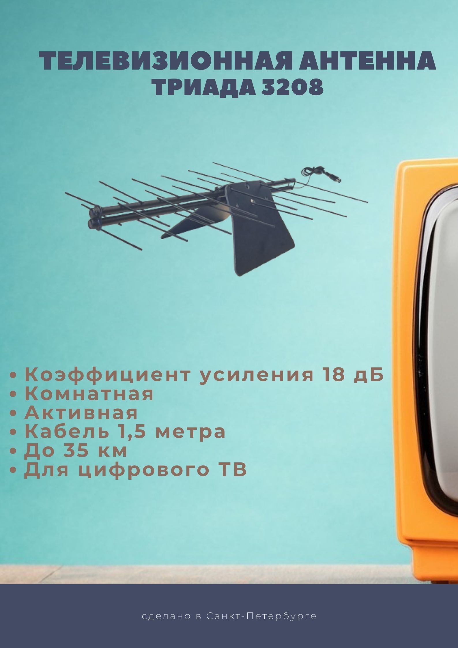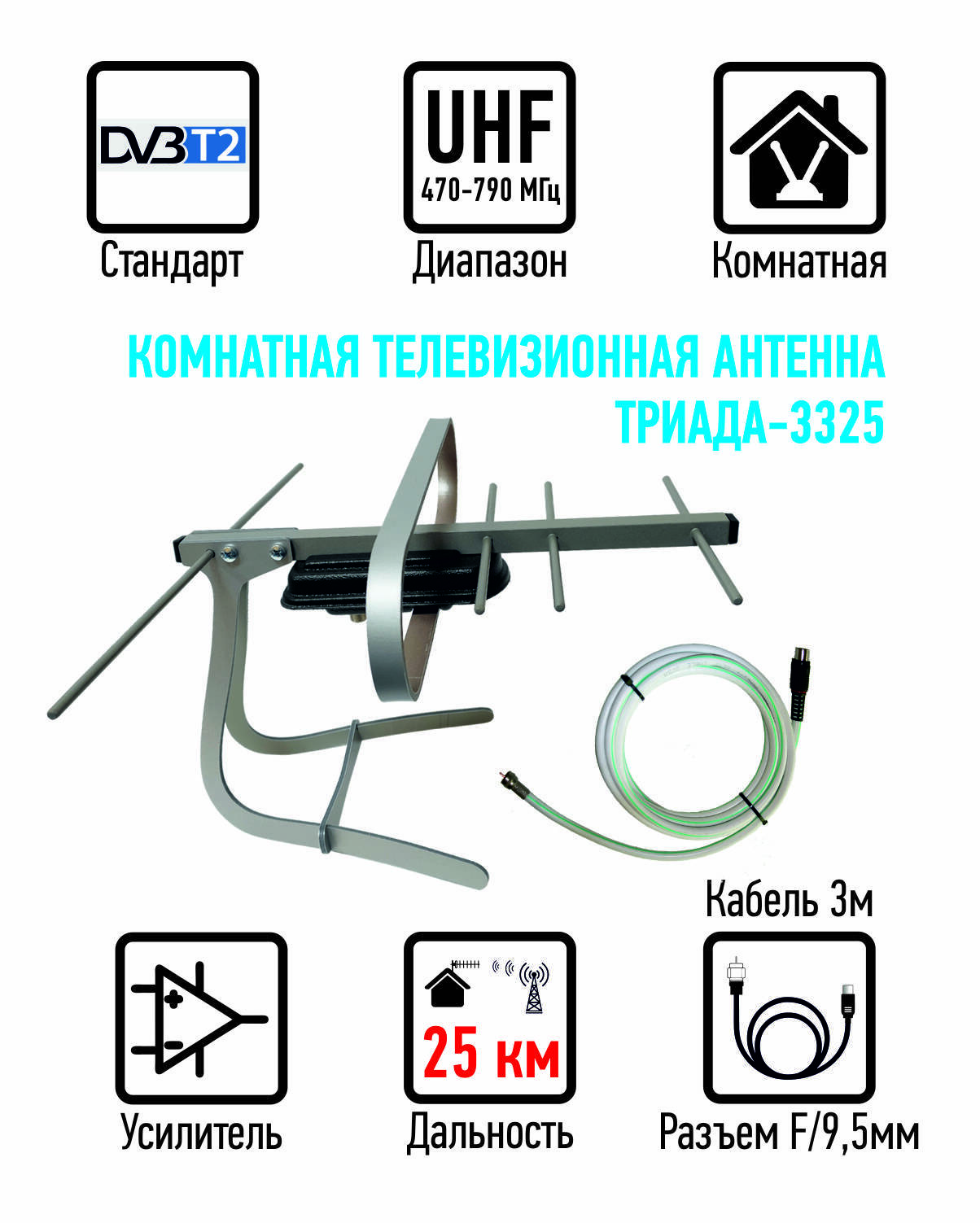 Комнатная антенна Триада-3325 для цифрового ТВ, DVB-T2, активная, черная, кабель 3 метра, штекер 9,5