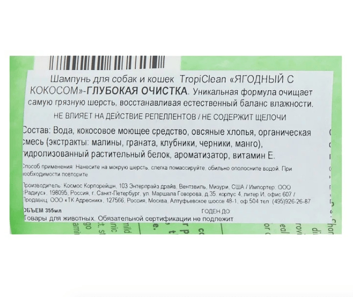Tropiclean Deep Cleaning Ягодный шампунь, глубокая очистка для кошек и собак, 355 мл