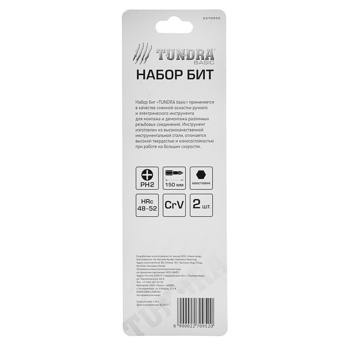 Биты TUNDRA, намагниченные, сталь CrV, PH2 х 150 мм, 2 шт.